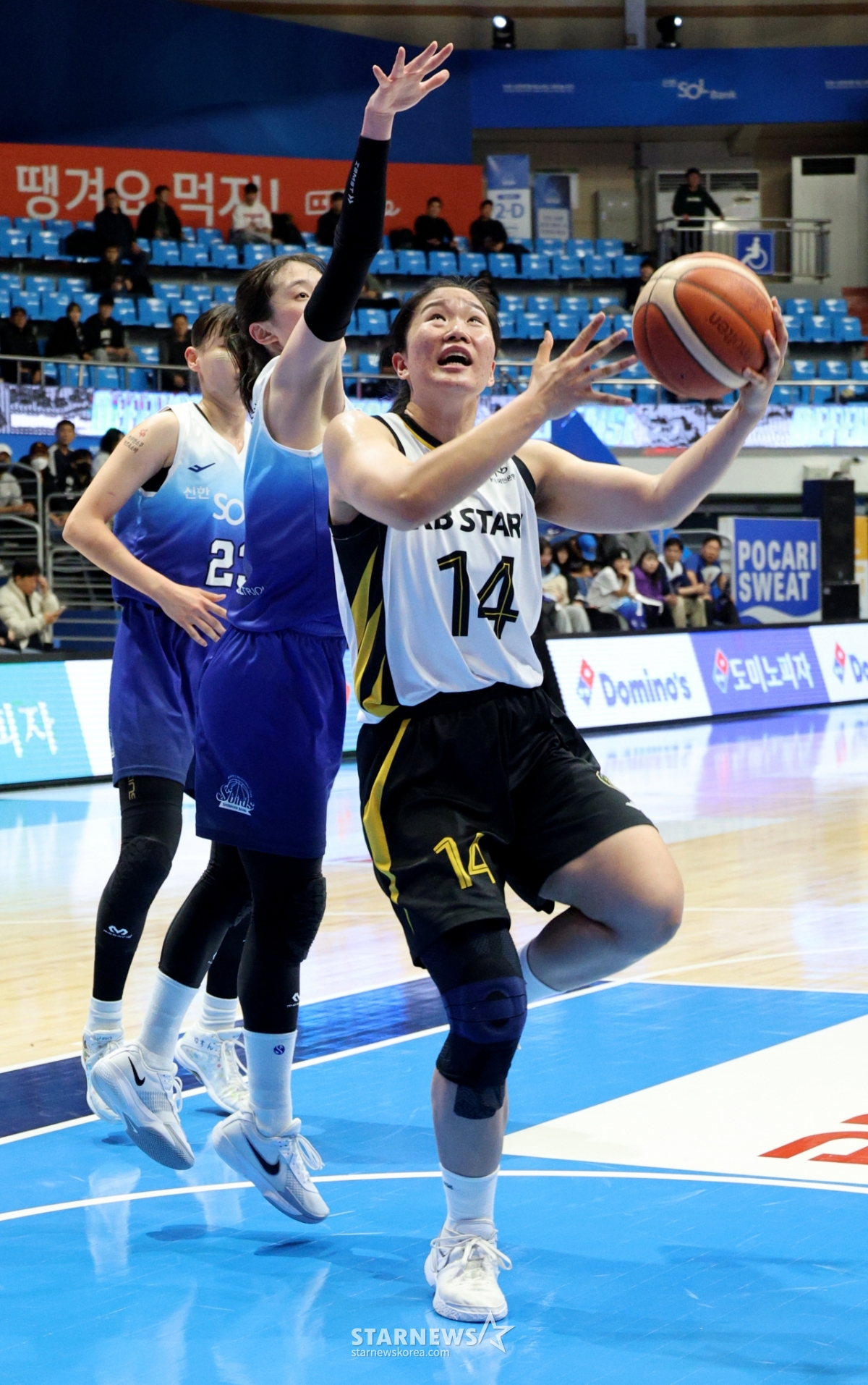 KB 송윤하가 인천 도원체육관에서 열린 신한은행과의 경기에서 수비를 제치고 레이업슛을 성공시켰다.