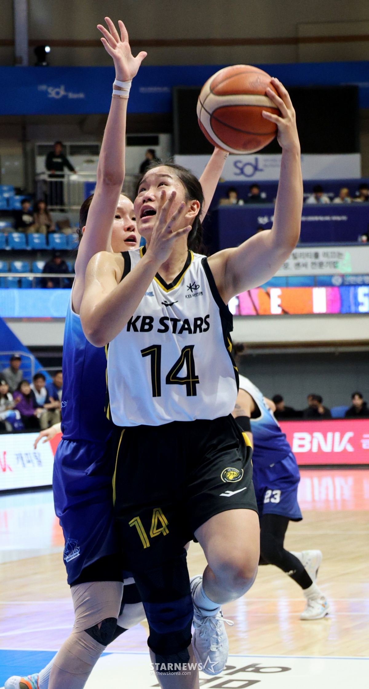 KB 송윤하가 26일 인천 도원체육관에서 열린 2025-2026 BNK금융 WKBL 신한은행과 KB스타즈 경기에서 수비를 따돌리며 슈팅을 시도하고 있다. 2025.11.26.