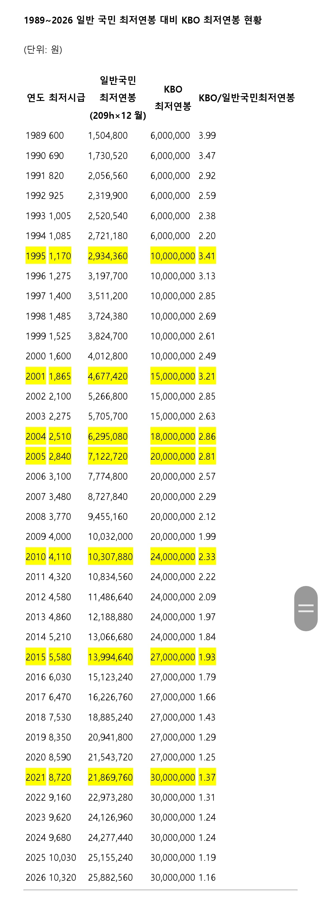 실제 비교를 위해 1989년부터 2026년까지 최저임금위원회가 고시한 시간급(주 40시간+주휴 포함 월 209시간 기준)을 연봉으로 환산해 KBO 최저연봉과 비교해 보면 흐름이 극명하게 드러난다. (우리나라 최저임금 제도는 1988년부터 시행됐고 이 해는 업종별 시간급이 달라 단일 최저임금이 도입된 1989년부터 KBO 최저연봉과 비교함) 1989년에는 KBO 최저연봉이 일반 국민 최저연봉의 3.99배였지만 2026년에는 1.16배에 불과하다. 즉 38년 동안 프로야구 선수 최저연봉의 상대적 가치는 사실상 '일반 국민과 별반 차이가 없는 수준'으로 떨어진 셈이다.