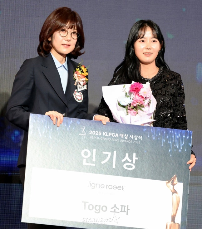 골프 팬들의 온라인 투표로 선정된 인기상의 영광은 황유민(22·롯데)이 2년 연속 수상했다. 총투표수 2만 1179표 중 4508표를 득표, 2위 박현경(25·메디힐)의 2006표를 2배 이상 따돌리며 올해 최고의 인기 선수로 등극했다. 부상으로 800만 원 상당의 리네로제 소파를 받았다.