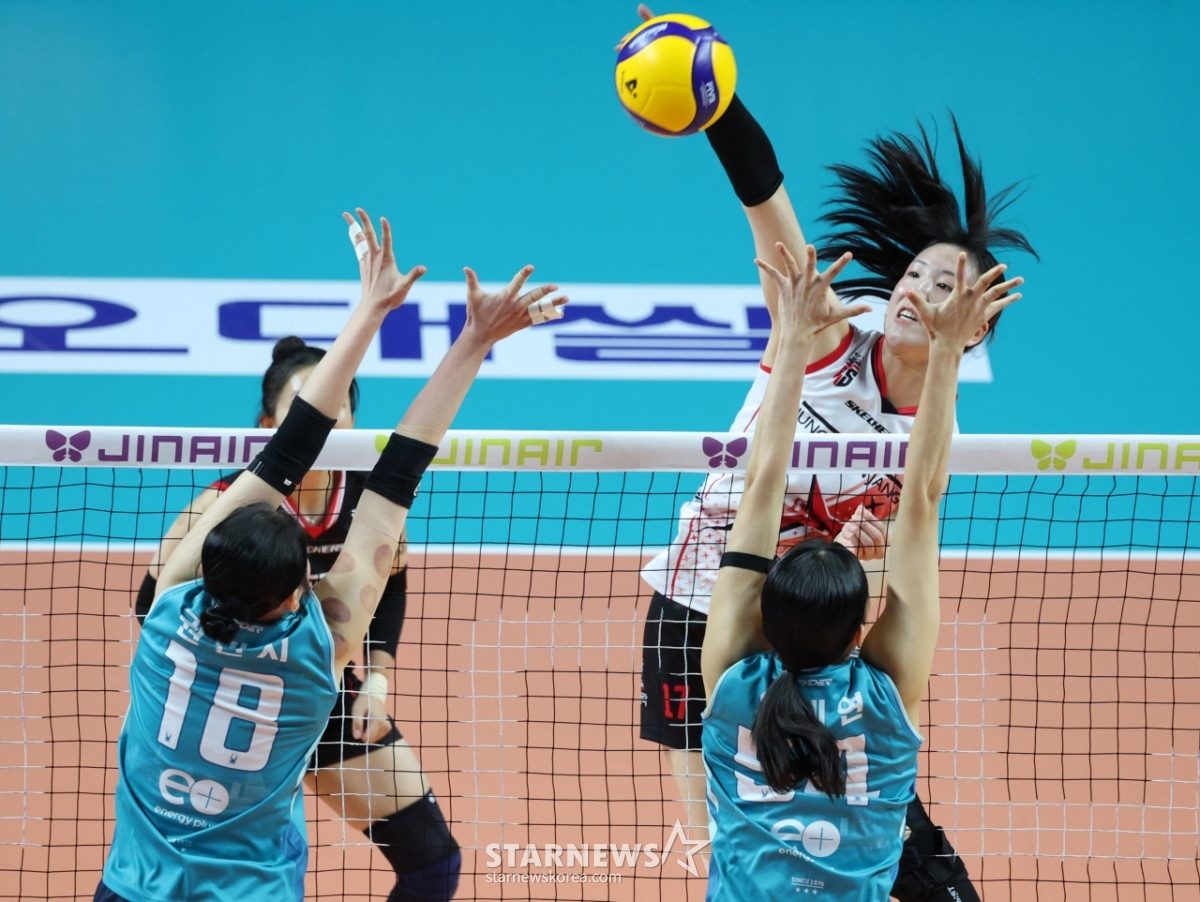 스포츠일반[포토] 정호영 '천녀유혼 바늘 공격'발행 : 2025.11.28 ・ 20:12장충=김진경 대기자2025-2026 V-리그 여자부 GS칼텍스 대 정관장 경기가 28일 서울 장충체육관에서 열렸다.정관장 정호영이 GS칼텍스 권민지, 오세연의 블로킹 위로 강스파이크를 날리고 있다.<저작권자 © 스타뉴스, 무단전재 및 재배포 금지>프로배구V리그스파이크블로킹정관장GS칼텍스추천 기사김진경 대기자기자홈좋아요 스포츠-일반의 인기 급상승 뉴스스포츠-일반의 최신 뉴스