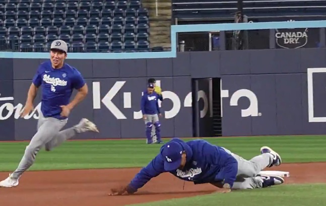 이는 김혜성과 달리기 시합 때문이었다. 다저스의 공식 SNS 계정이 공개한 영상에서 로버츠 감독과 김혜성과 대결을 펼쳤다. 김혜성은 1루 베이스를 밟고, 로버츠 감독은 몇 발짝 떨어진 지점에서 스타트를 했다. 나이는 속일 수 없는 듯 2루 베이스에 도달하자 김혜성이 역전에 성공했다. 열심히 뛰던 로버츠 감독은 그만 앞으로 넘어지고 말았다. 마치 헤드퍼스트 슬라이딩을 하는 듯했다.