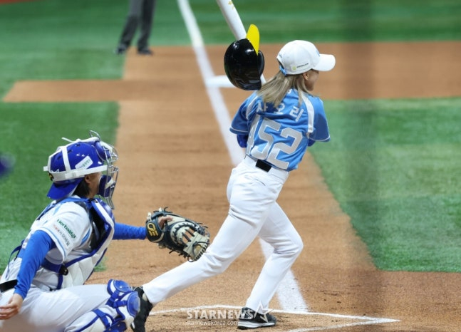 2회말엔 트로트 가수 안성훈이 선두 타자로 나서 키움 김태진을 상대로 2-유 간을 가르는 중전 안타를 날렸다. 이어 여자 야구 선수 김현아가 좌측 큼지막한 2루타를 날리며 선취 타점을 올렸다.