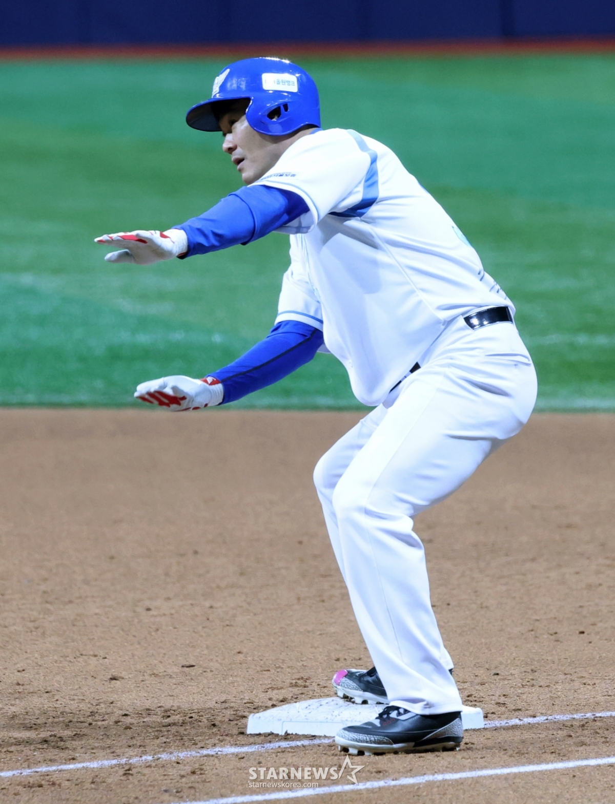 양신팀 노경은이 적시타를 날리고 출루한 후 세리머니를 하고 있다.