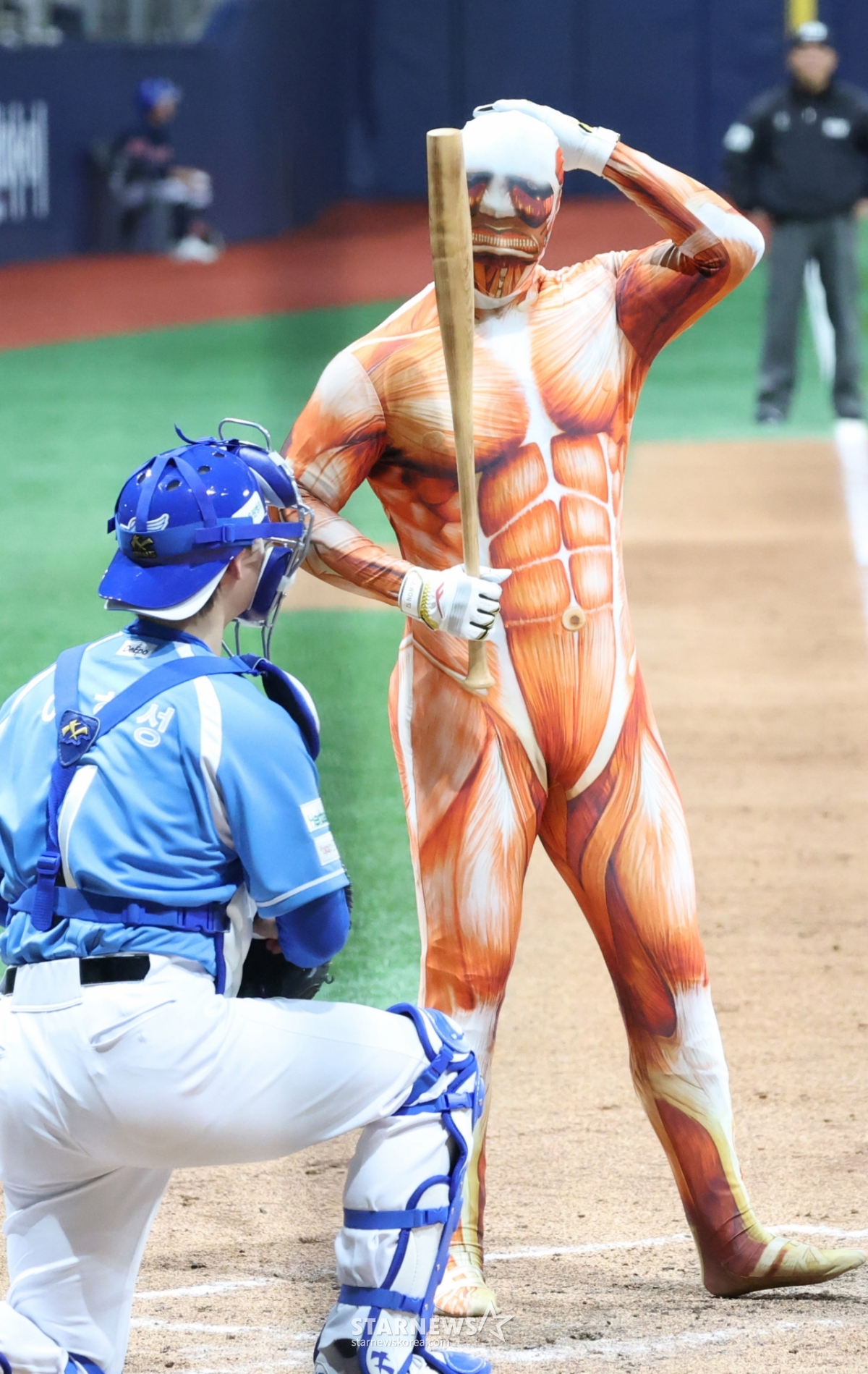경북고 선수 시절, 투수와 타자를 겸업하며 '전타니' 별명을 획득한 투수 전미르는 이날 마지막회인 7회말 8-8 동점 상황에서 진격의 거인 속 거인 의상을 입고 타석에 섰다.