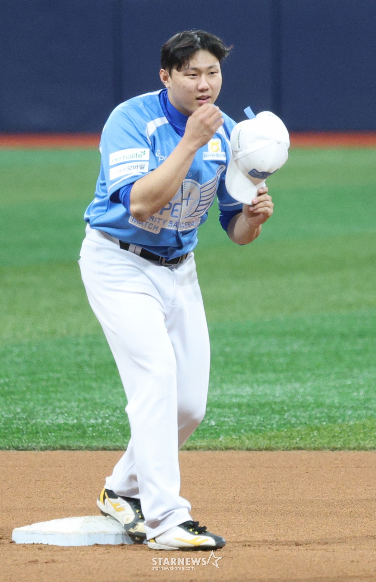 마포팀 배찬승이 2루타를 날리고 출루한 후 더그아웃을 향해 인사하고 있다.