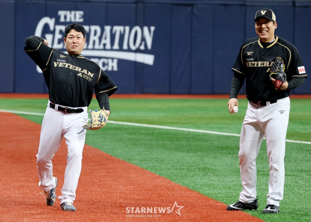 베테랑 양의지가 30일 고척스카이돔에서 열린 ‘더 제너레이션 매치 상상인-메디카코리아’ 에서 경쟁자 김현수가 지켜보는 가운데 피칭연습을 하고 있다. 더 제너레이션 매치는 팀 베테랑(1990년대생)과 팀 라이징(2000년대생)이 세대간 대결을 펼치는 경기로 7이닝으로 진행된다. 2025.11.30.