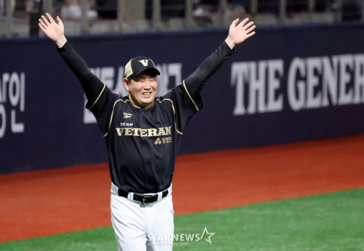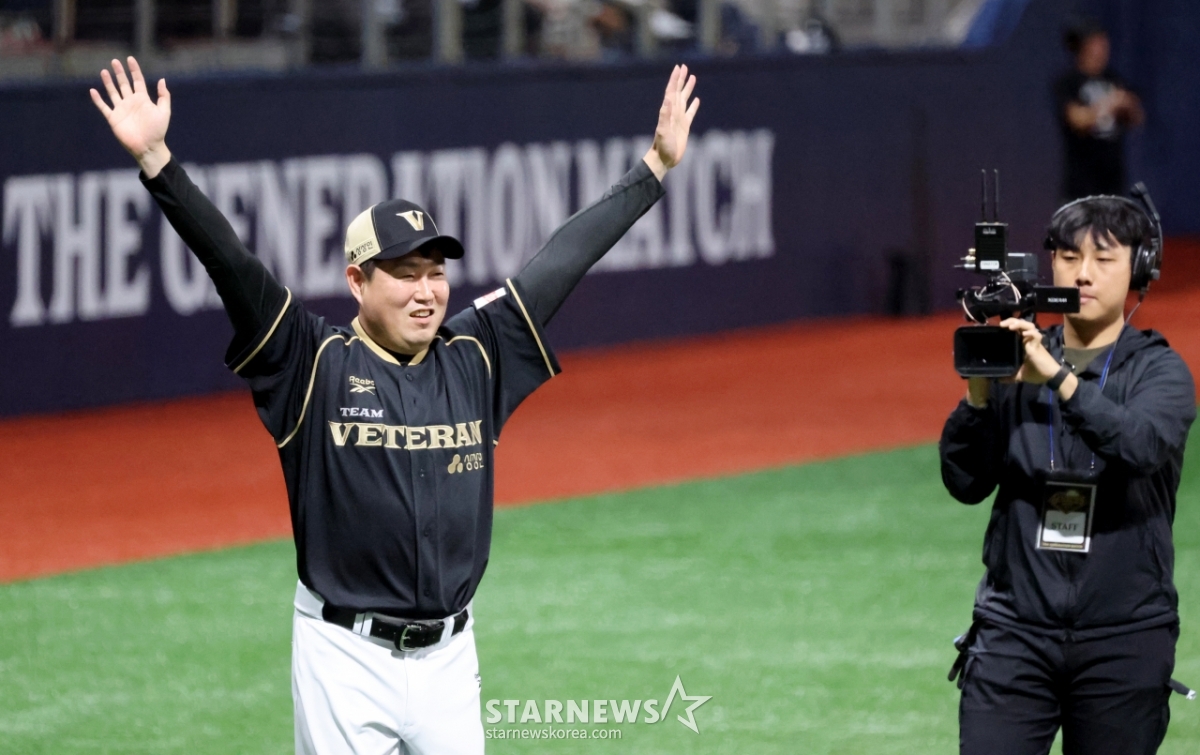 베테랑 양의지가 30일 고척스카이돔에서 열린 ‘더 제너레이션 매치 상상인-메디카코리아’ 에서 경쟁자 개회식을 위해 그라운드로 나서고 있다. 더 제너레이션 매치는 팀 베테랑(1990년대생)과 팀 라이징(2000년대생)이 세대간 대결을 펼치는 경기로 7이닝으로 진행된다. 2025.11.30.