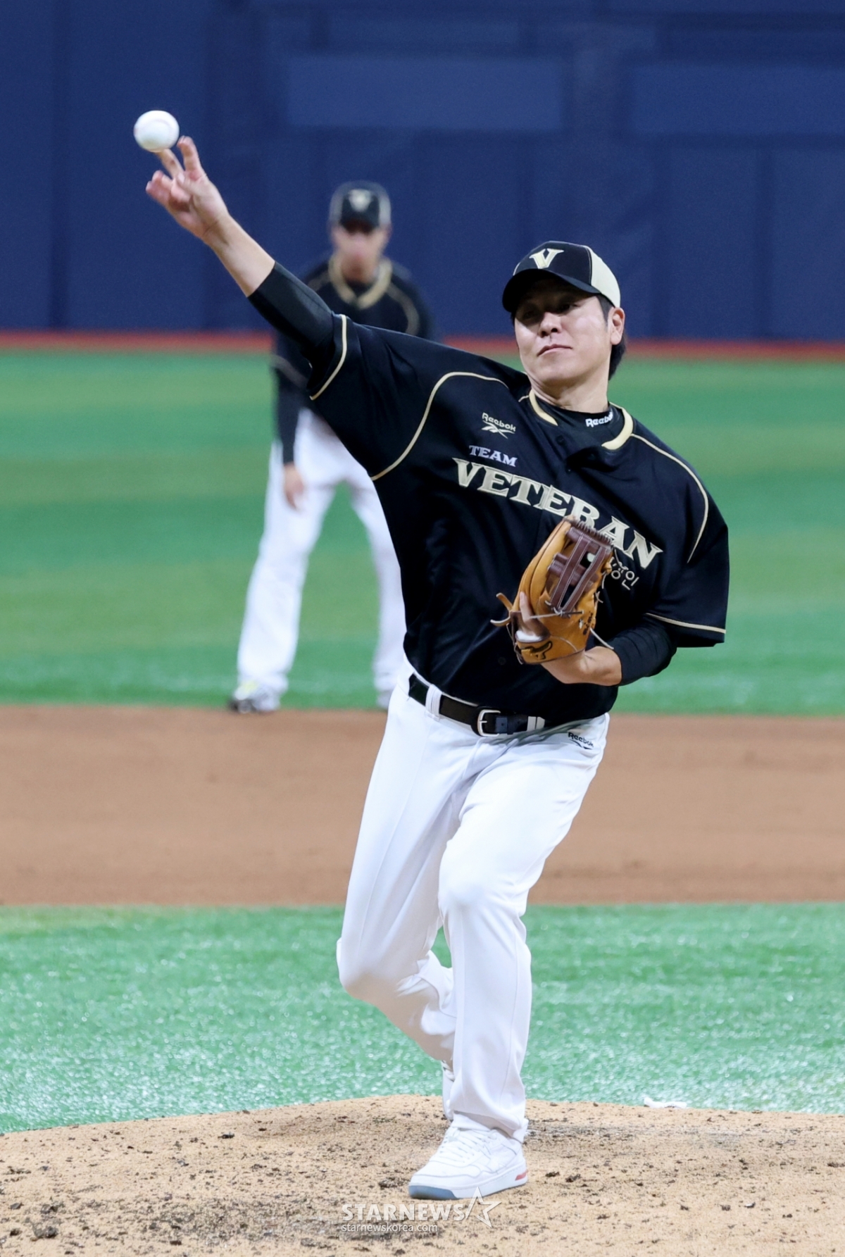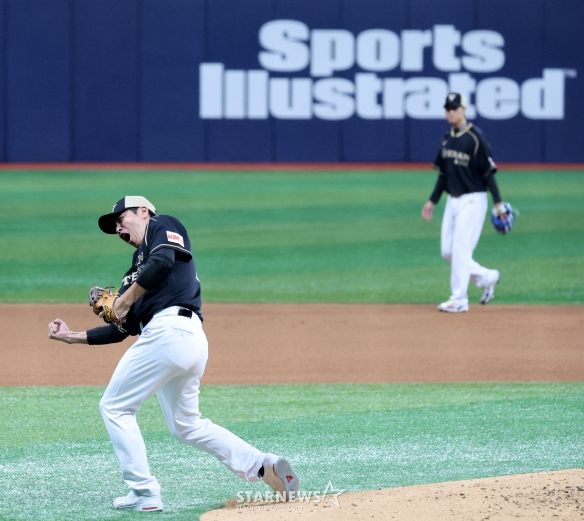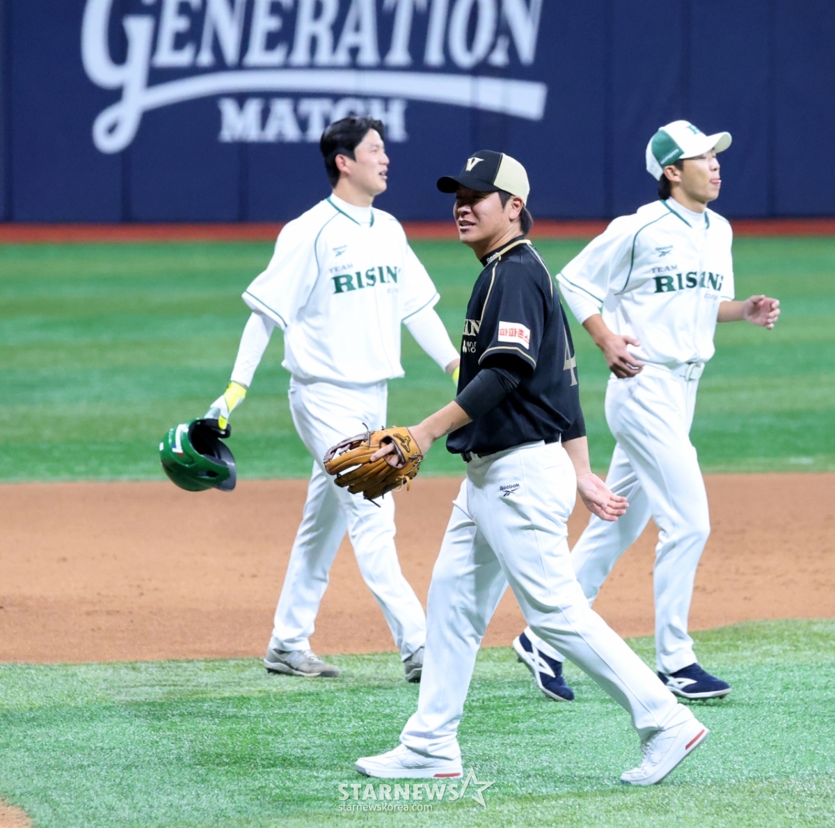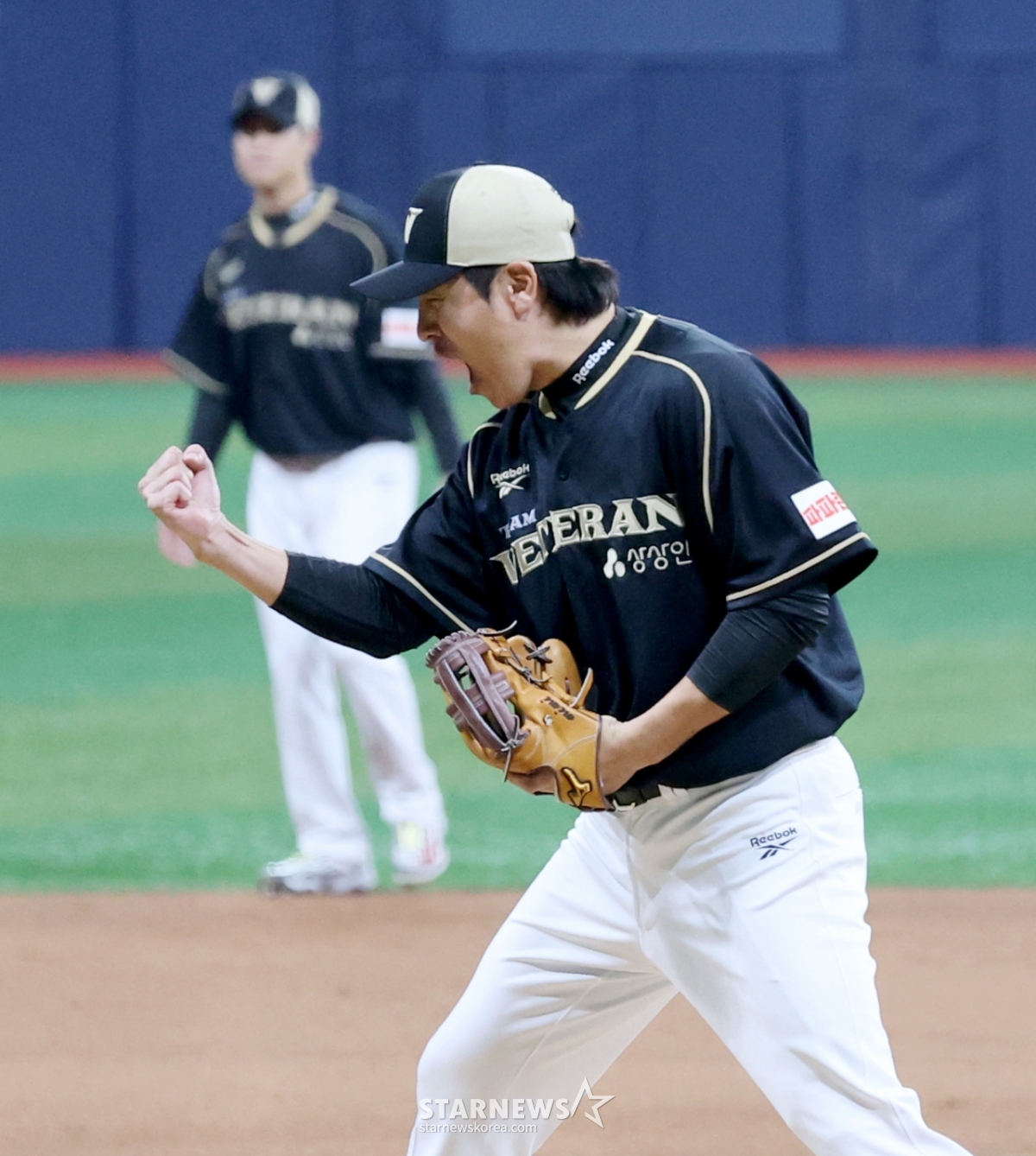 베테랑팀 감독 강민호가 30일 고척스카이돔에서 열린 ‘더 제너레이션 매치 상상인-메디카코리아’ 5회초 아웃카운트 하나를 잡아낸 후 포효하고 있다.. 더 제너레이션 매치는 팀 베테랑(1990년대생)과 팀 라이징(2000년대생)이 세대간 대결을 펼치는 경기로 7이닝으로 진행된다. 2025.11.30.