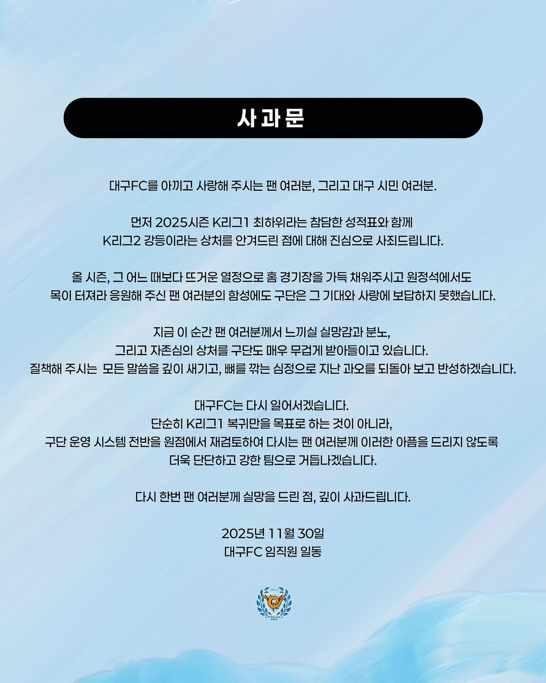 프로축구 K리그1 대구FC의 다음 시즌 K리그2(2부) 강등이 확정됐다. 대구가 K리그2에 속하는 건 지난 2016시즌 이후 무려 10년 만이다. 2부 강등이 확정되자 팬들은 물론 감독, 선수들 모두 눈물을 쏟은 가운데, 대구 구단은 "진심으로 사죄드린다"면서 팬들과 대구 시민들에게 공식 사과했다.