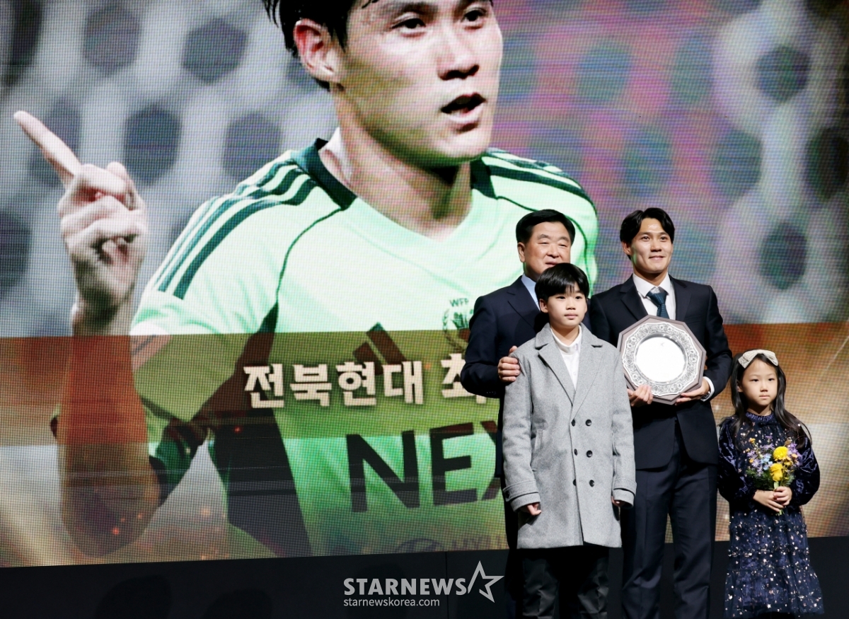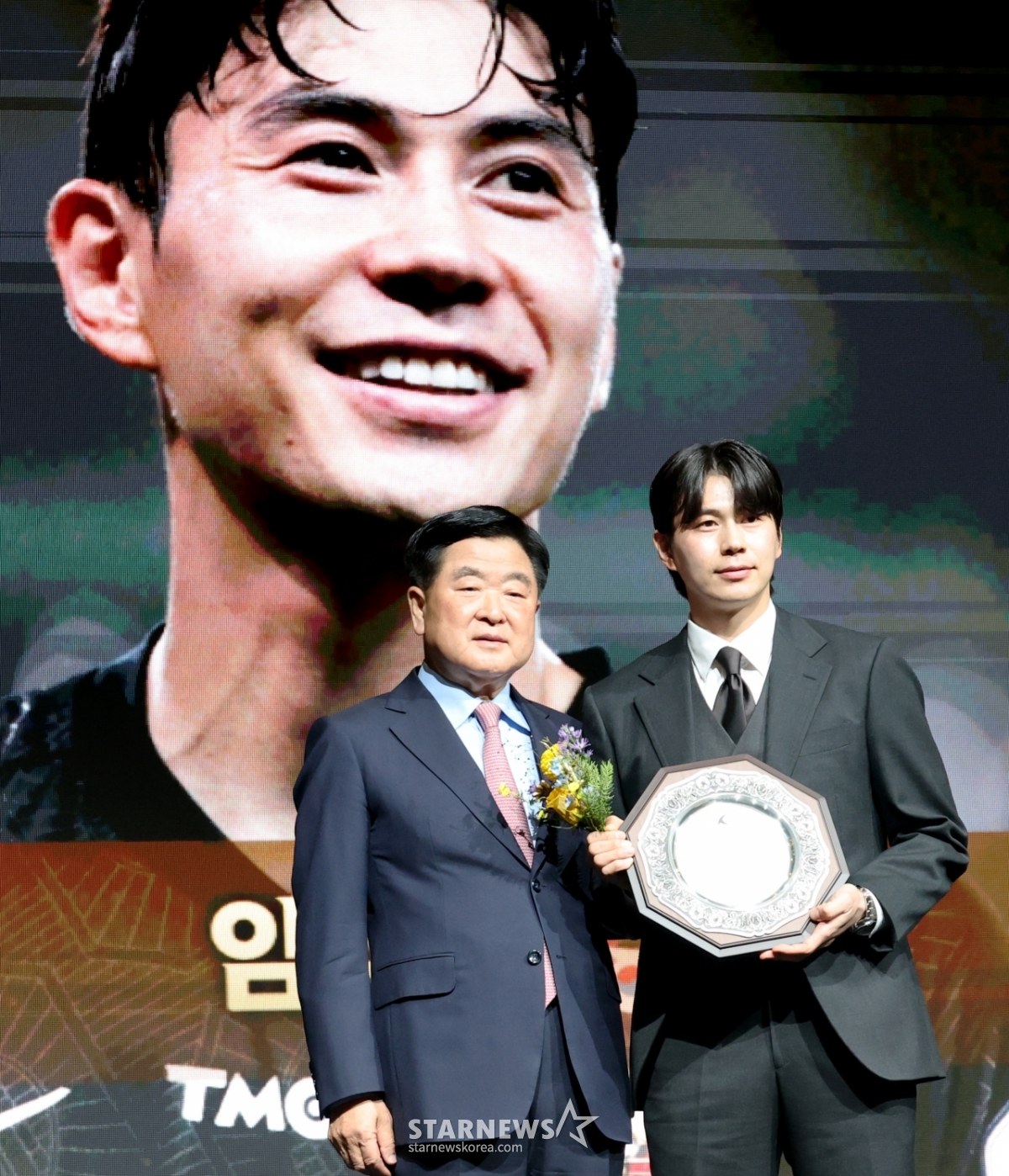 최철순과 임상혁이 1일 서울 홍은동 스위스그랜드호텔에서 열린 하나은행 K리그 2025 대상시상식에서 공로상을 수상후 권오갑 총재와 기념촬영을 하고 있다. 한국프로축구연맹은 1일 오전 베스트 11에 선정된 송범근(전북), 이명재(대전), 야잔(서울), 홍정호(전북), 김문환(대전), 송민규(전북), 김진규(전북), 박진섭(전북), 강상윤(전북), 이동경(울산), 싸박(수원FC) 11명의 명단을 발표했다. 2025.12.01.