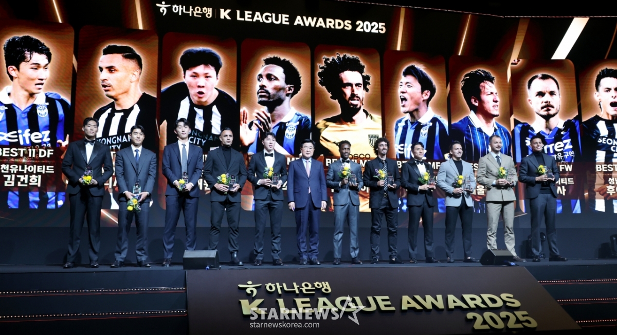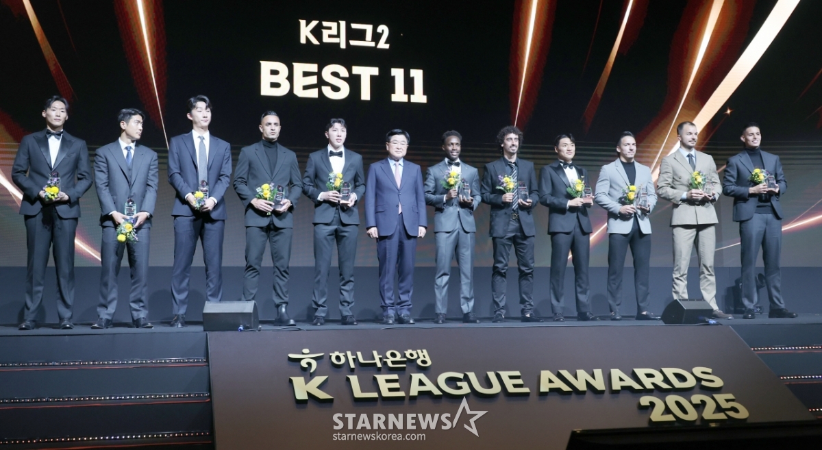 k리그2 베스트11에 뽑힌 선수들이 1일 서울 홍은동 스위스그랜드호텔에서 열린 하나은행 K리그 2025 대상시상식에서 공로상을 수상후 권오갑 프로축구연맹 총재와 기념촬영을 하고 있다.