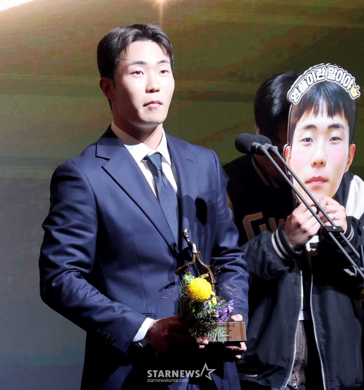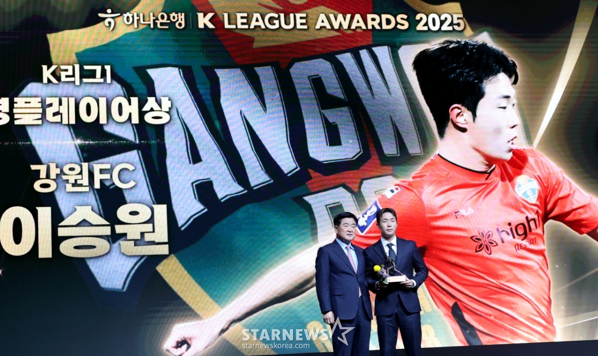 영플레이어상을 수상한 이승원이 1일 서울 홍은동 스위스그랜드호텔에서 열린 하나은행 K리그 2025 대상시상식에서 수상후 권오갑 프로축구연맹 총재와 기념촬영을 하고 있다. 한국프로축구연맹은 베스트 11에 선정된 송범근(전북), 이명재(대전), 야잔(서울), 홍정호(전북), 김문환(대전), 송민규(전북), 김진규(전북), 박진섭(전북), 강상윤(전북), 이동경(울산), 싸박(수원FC) 을 선정했다. 2025.12.01.
