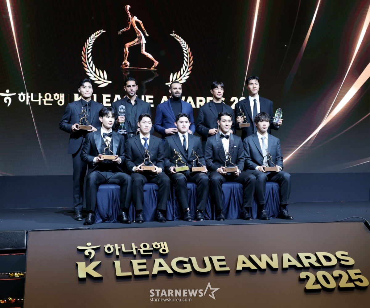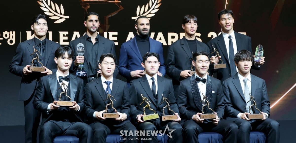 K리그1 베스트11 선수들이 1일 서울 홍은동 스위스그랜드호텔에서 열린 하나은행 K리그 2025 대상시상식에서 감독상을 수상한 후 기념촬영을 하고 있다. 한국프로축구연맹은 베스트 11에 선정된 송범근(전북), 이명재(대전), 야잔(서울), 홍정호(전북), 김문환(대전), 송민규(전북), 김진규(전북), 박진섭(전북), 강상윤(전북), 이동경(울산), 싸박(수원FC) 을 선정했다. 2025.12.01.