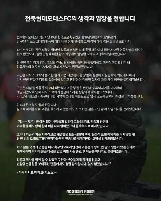 이에 전북은 공식 사회관계망서비스(SNS)를 통해 "상벌위가 타노스 코치에 내린 징계 결정과 배경에 깊은 유감을 표한다"며 "타노스 코치는 심리적 고통을 이유로 사임 의사를 전달했다"고 알렸다.