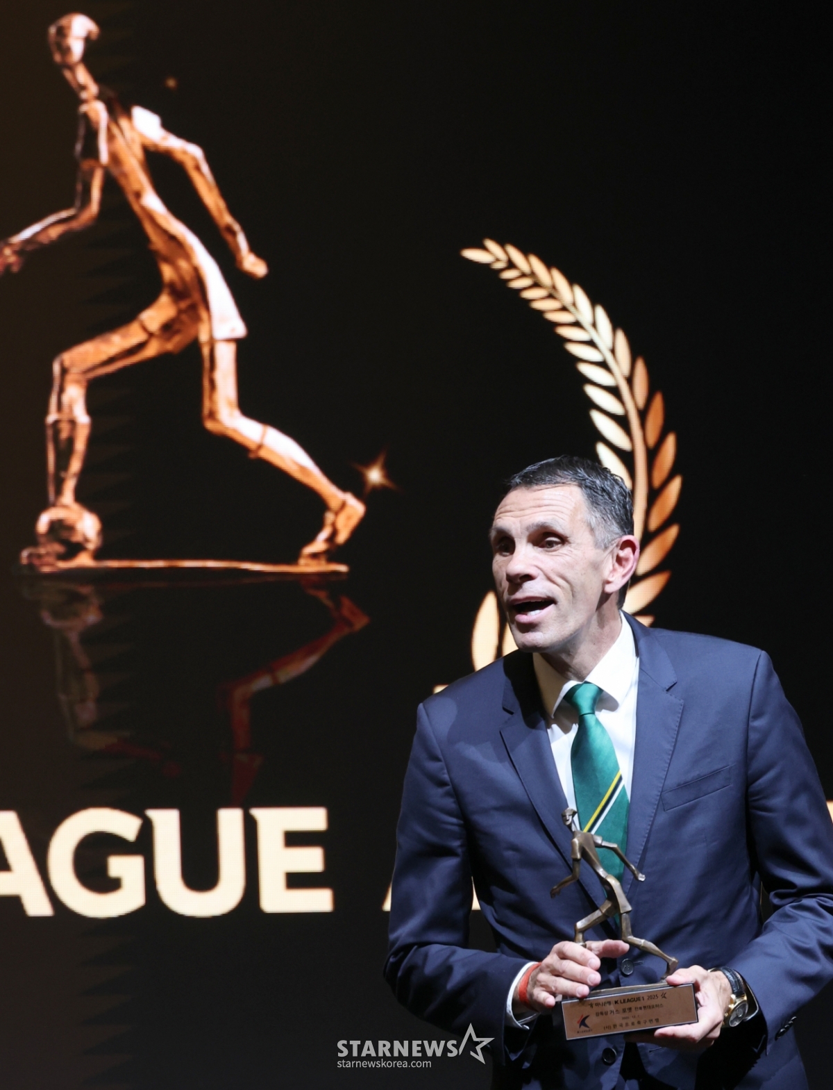 K리그1 감독상 거스 포옛 전북감독이 1일 서울 홍은동 스위스그랜드호텔에서 열린 하나은행 K리그 2025 대상시상식에서 감독상을 수상한 후 기념촬영을 하고 있다. 한국프로축구연맹은 베스트 11에 선정된 송범근(전북), 이명재(대전), 야잔(서울), 홍정호(전북), 김문환(대전), 송민규(전북), 김진규(전북), 박진섭(전북), 강상윤(전북), 이동경(울산), 싸박(수원FC) 을 선정했다. 2025.12.01.