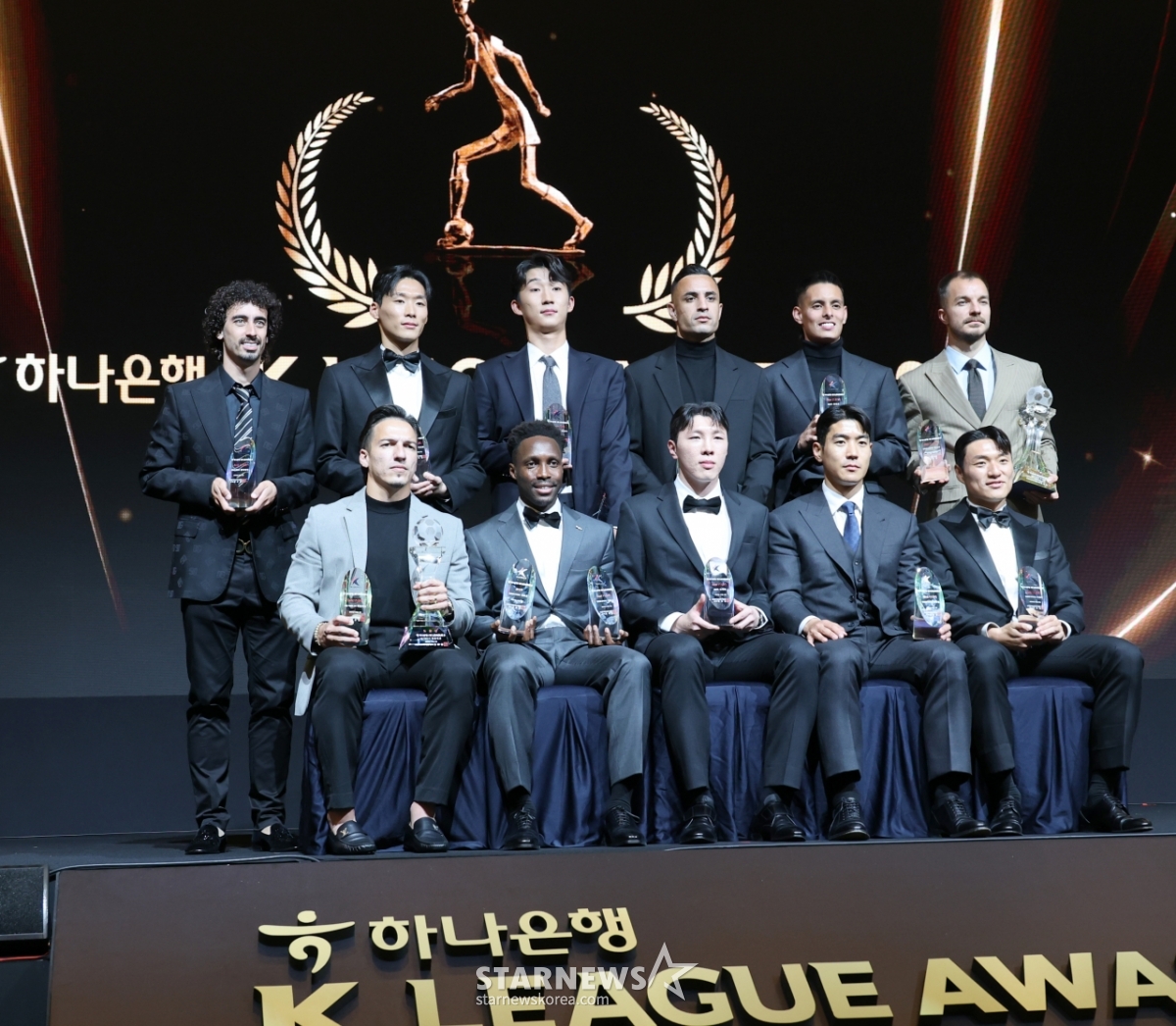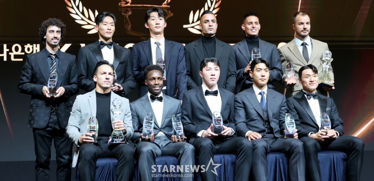 K리그2 베스트11 선수들이 1일 서울 홍은동 스위스그랜드호텔에서 열린 하나은행 K리그 2025 대상시상식에서 감독상을 수상한 후 기념촬영을 하고 있다. 한국프로축구연맹은 베스트 11에 선정된 송범근(전북), 이명재(대전), 야잔(서울), 홍정호(전북), 김문환(대전), 송민규(전북), 김진규(전북), 박진섭(전북), 강상윤(전북), 이동경(울산), 싸박(수원FC) 을 선정했다. 2025.12.01.