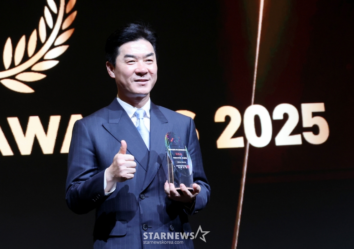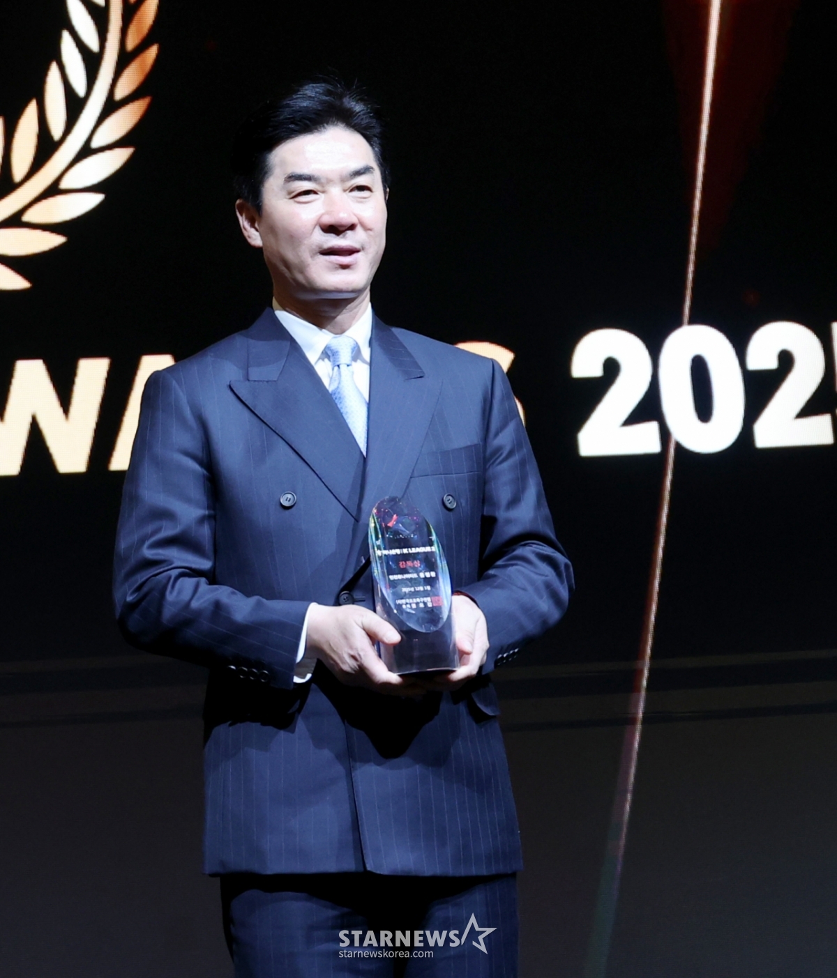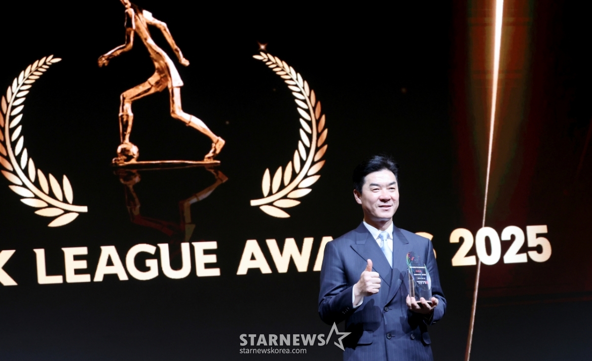 K리그2 베스트11 감독상 윤정환이 1일 서울 홍은동 스위스그랜드호텔에서 열린 하나은행 K리그 2025 대상시상식에서 감독상을 수상한 후 기념촬영을 하고 있다. 한국프로축구연맹은 베스트 11에 선정된 송범근(전북), 이명재(대전), 야잔(서울), 홍정호(전북), 김문환(대전), 송민규(전북), 김진규(전북), 박진섭(전북), 강상윤(전북), 이동경(울산), 싸박(수원FC) 을 선정했다. 2025.12.01.
