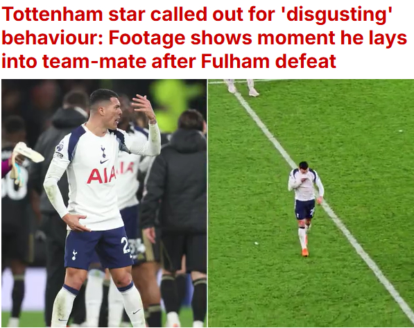 영국 '데일리 메일'은 1일(한국시간) "풀럼과 경기 종료 후에는 토트넘 선수 두 선수가 충돌했다"며 "페드로 포로(26) 루카스 베리발(19·이상 토트넘)에게 격하게 손짓하며 분노를 드러낸 장면이 팬들의 공분을 샀다"고 보도했다.