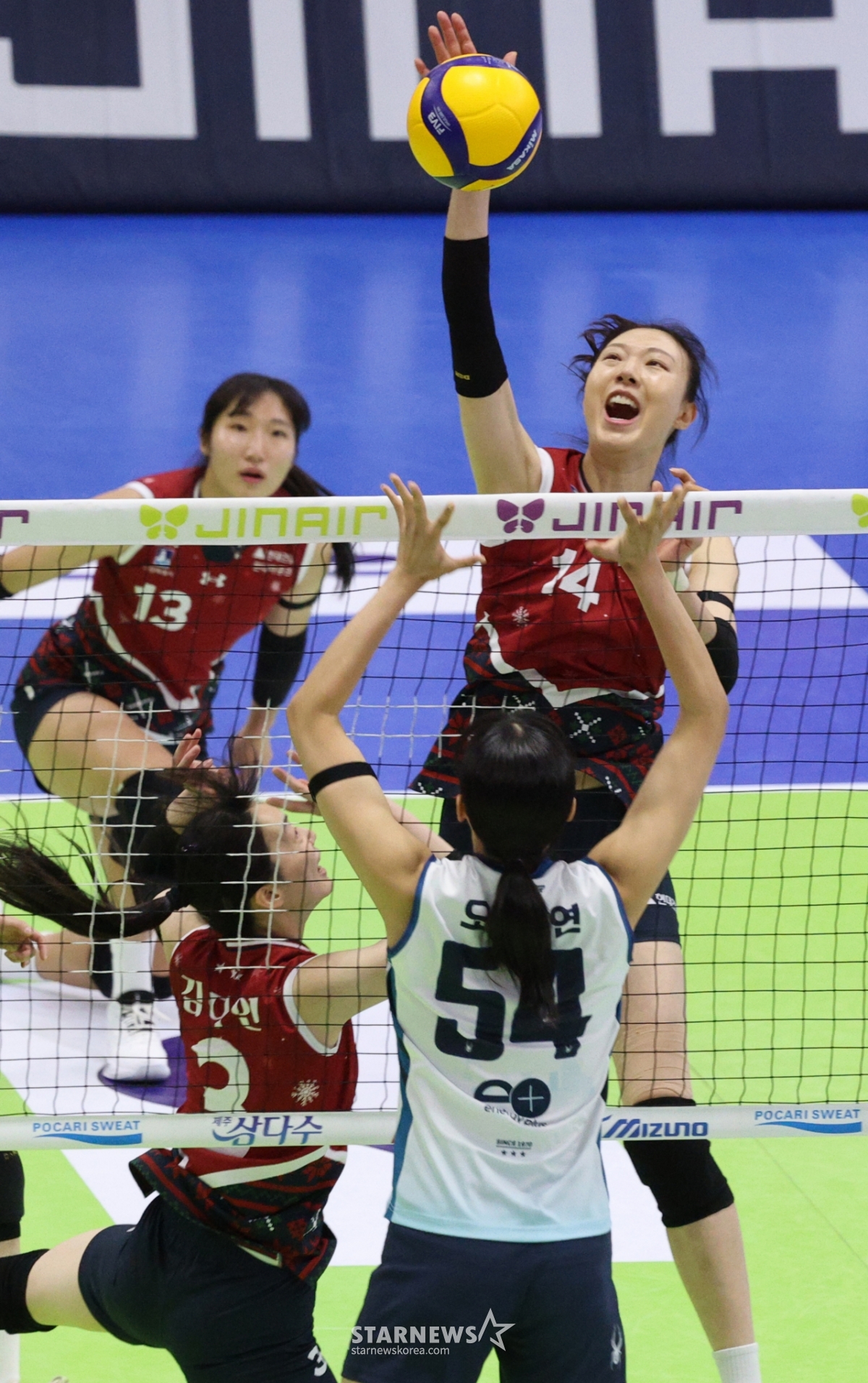 스포츠일반[포토] 양효진 '완벽한 시간차'발행 : 2025.12.02 ・ 19:48수원=김진경 대기자2025-2026 V-리그 여자부 현대건설 대 GS칼텍스 경기가 2일 경기도 수원체육관에서 열렸다.현대건설 양효진이 GS칼텍스 오세연의 블로킹 위로 강스파이크를 날리고 있다.<저작권자 © 스타뉴스, 무단전재 및 재배포 금지>프로배구코보KOVOV리그현대건설GS칼텍스추천 기사김진경 대기자기자홈좋아요 스포츠-일반의 인기 급상승 뉴스스포츠-일반의 최신 뉴스