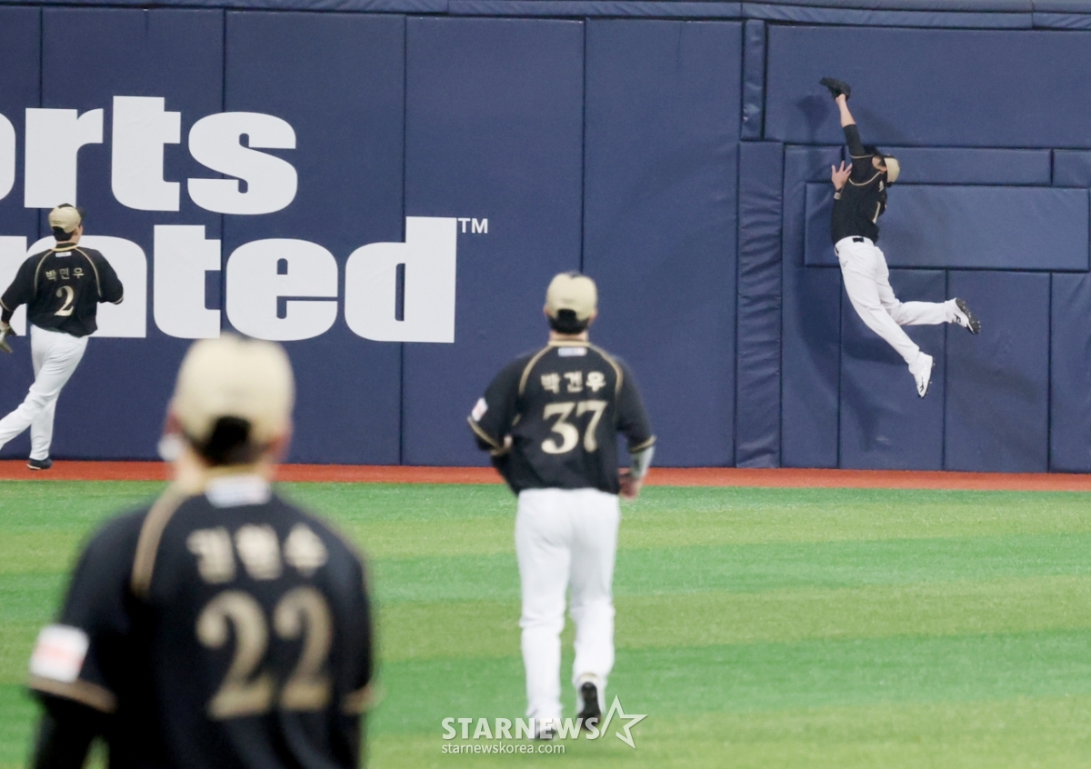 베테랑팀 박찬호가 30일 고척스카이돔에서 열린 ‘더 제너레이션 매치 상상인-메디카코리아’ 에서 1회초 안현민의 펜스 상단에 맞을 안타성타구를 점프해 잡아내고 있다. 아래 영상으로 확인해보자.
