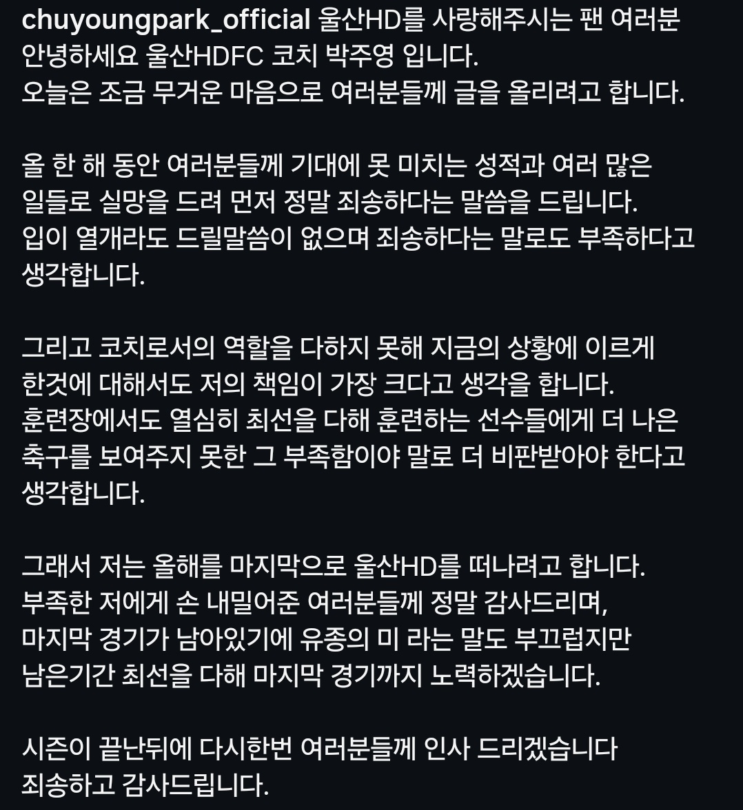 박주영(40)은 지난 4일 밤 개인 사회관계망서비스(SNS)를 통해 "울산HD를 사랑해주시는 팬 여러분, 코치 박주영입니다. 무거운 마음으로 글을 올리려 한다"며 "코치로서 역할을 다하지 못해 지금의 상황에 이르게 한 것에 대해 저의 책임이 가장 크다고 생각한다. 올해를 마지막으로 울산을 떠나려 한다"고 울산 코치칙 사임 의사를 밝혔다.