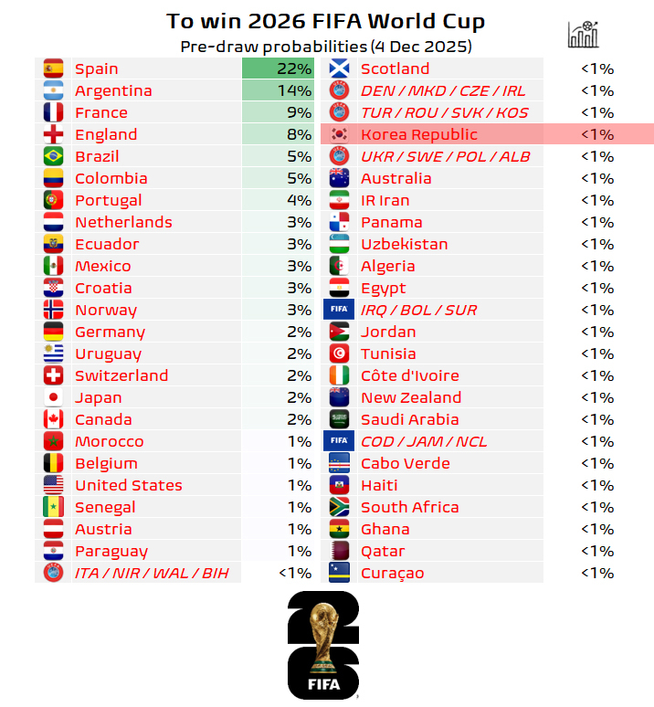 대한민국 축구 국가대표팀이 2026 국제축구연맹(FIFA) 북중미 월드컵에서 우승할 확률이 1%에 미치지 못한다는 전망이 나왔다.
