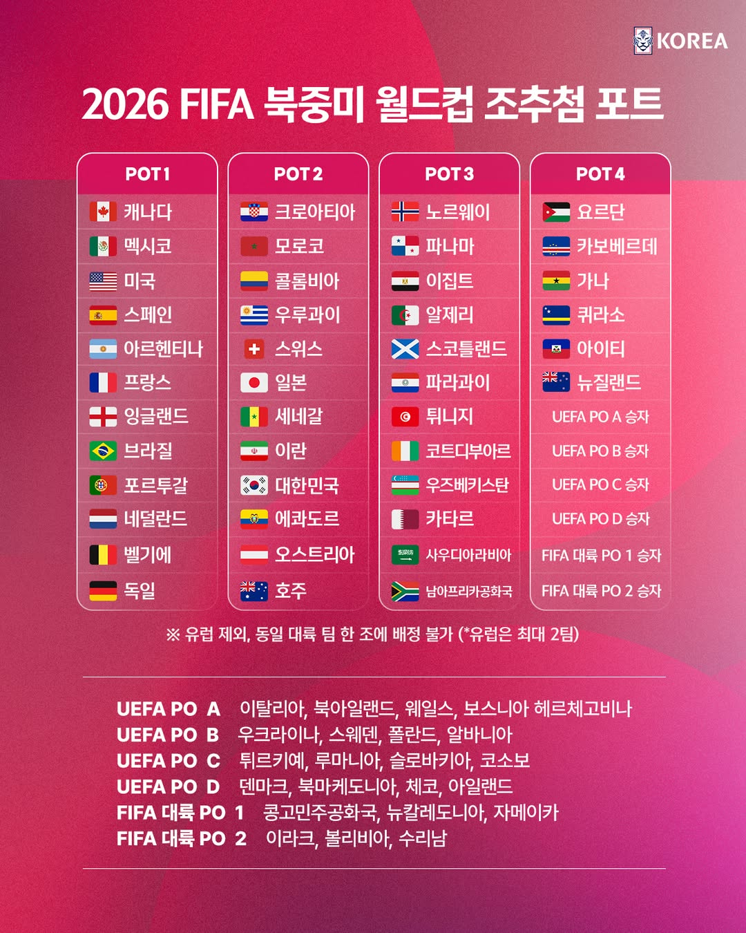 홍명보 감독이 이끄는 한국은 포트2에 속해 포트1, 포트3, 포트4에 속한 팀과 같은 조에 속하게 된다. 12개 팀씩 4개로 나뉜 포트는 개최국 3개국이 포트1에, PO 6개 패스가 포트4에 각각 배정된 뒤 남은 팀들의 FIFA 랭킹 순으로 나뉘었다.