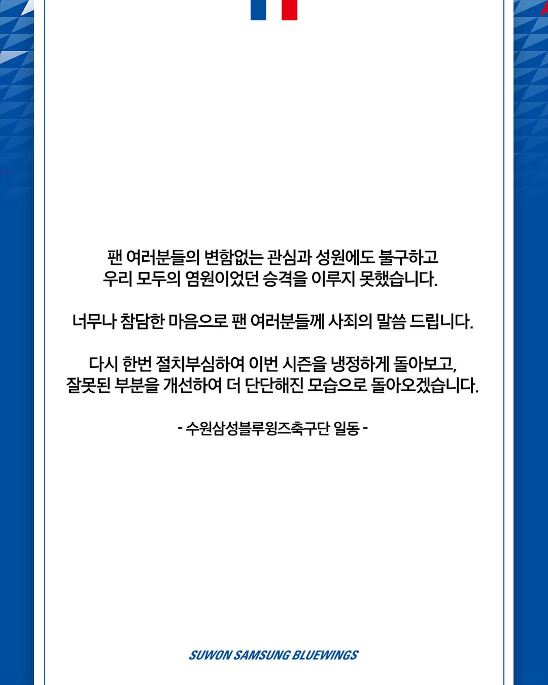 수원 구단은 7일 제주월드컵경기장에서 열린 제주 SK와의 승강 PO1 2차전에서 0-2로 져 K리그1 승격이 좌절된 직후 구단 공식 채널을 통해 "너무나 참담한 마음으로 팬 여러분들께 사죄의 말씀을 드린다"는 입장문을 발표했다.