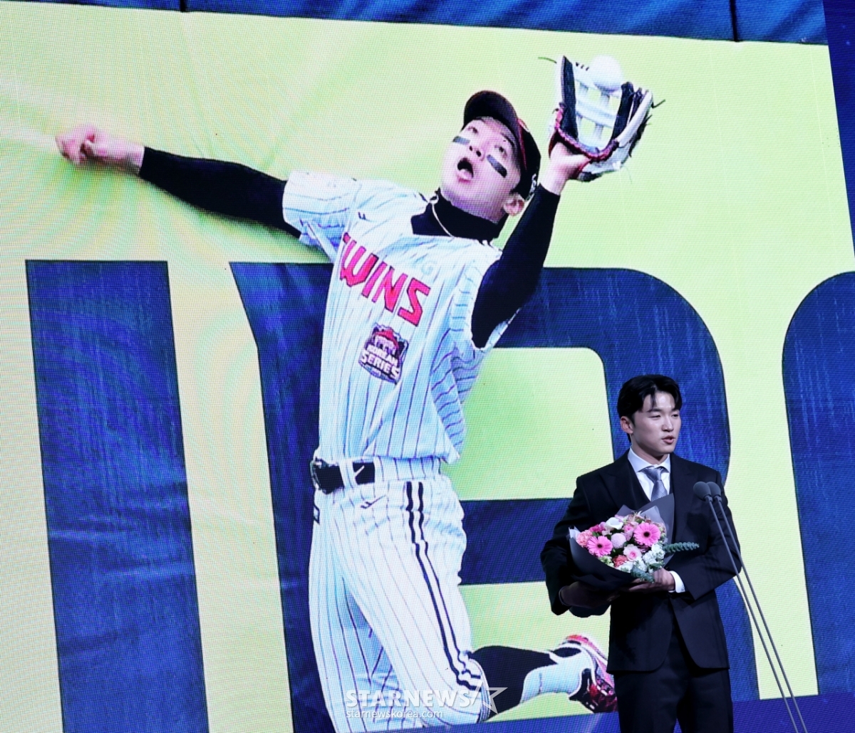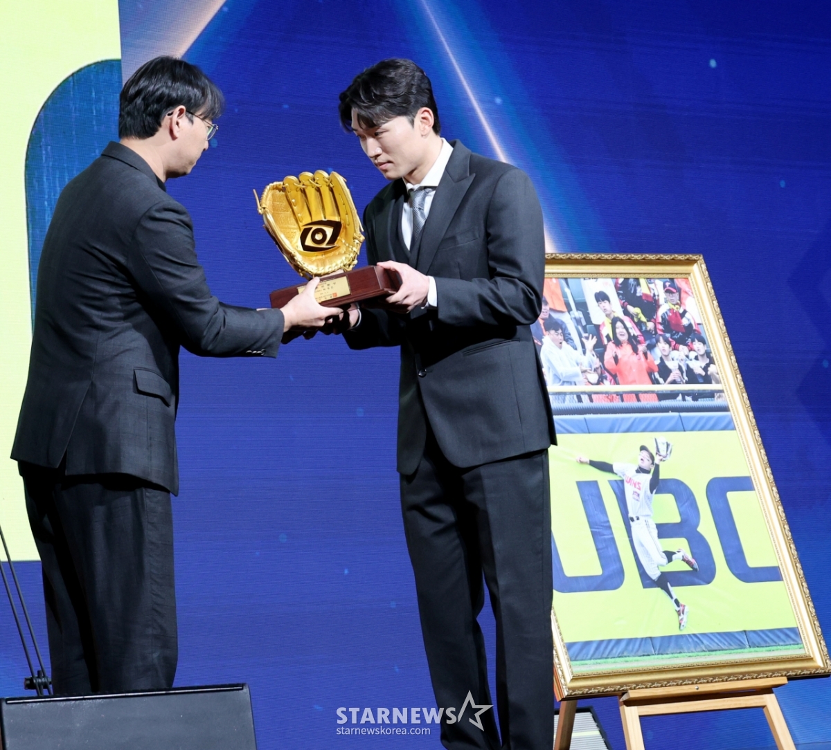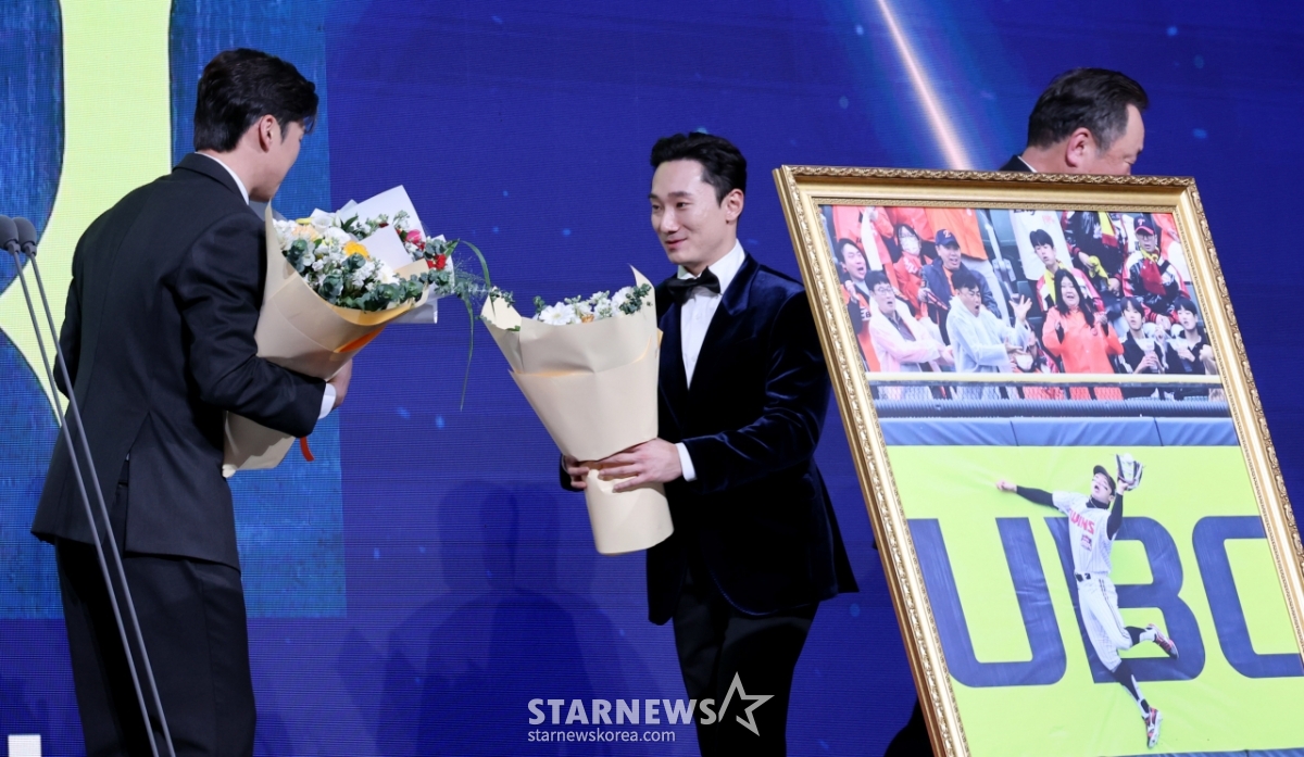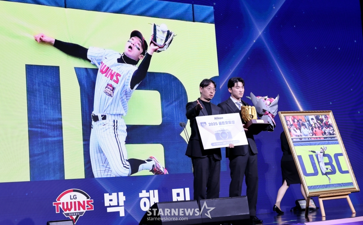 LG 트윈스 박해민이 9일 서울 송파구 잠실동 롯데호텔 월드에서 진행된 2025 신한은행 SOL 뱅크 KBO 골든글러브 시상식에서 골든포토상을 수상하며 한국스포츠사진기자회 지형준 회장과 기념촬영을 하고 있다.