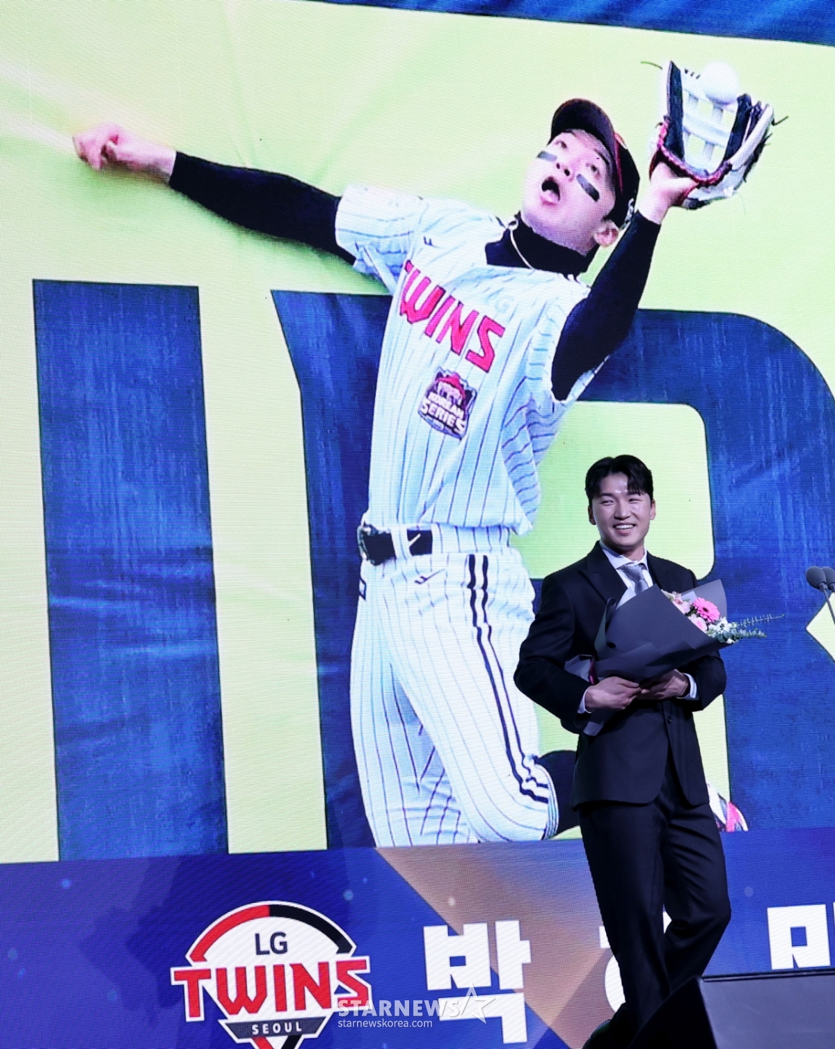 올해 선정된 사진은 LG 박해민이 한국시리즈 1차전에서 한화 문현빈의 장타성 타구를 펜스 앞에서 점프캐치 하는 장면이다.