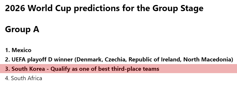 매체는 개최국이자 FIFA 랭킹(15위)이 가장 높은 멕시코가 A조 1위에 오를 것으로 내다봤고, 아직 어떤 팀이 A조에 합류할지 미정인 UEFA PO 패스 D 승자가 2위, 그리고 한국과 남아공이 그 뒤를 이을 것으로 내다봤다. UEFA PO 패스 D에서는 FIFA 랭킹 21위인 덴마크의 진출이 가장 유력하다. 한국은 FIFA 랭킹 22위다.
