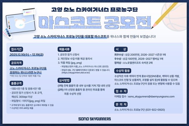 소노는 10일 "10일부터 19일까지 '고양 소노 스카이거너스 프로농구단 마스코트 공모전'을 개최한다"라고 밝혔다.