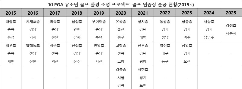 '유소년 골프 환경 조성 프로젝트'는 골프에 대한 높은 열의에도 불구하고 환경적인 제약으로 쉽게 접하지 못했던 학생들에게 골프를 접할 동기와 기회를 제공하기 위한 KLPGA의 골프 인프라 구축 사업이다.
