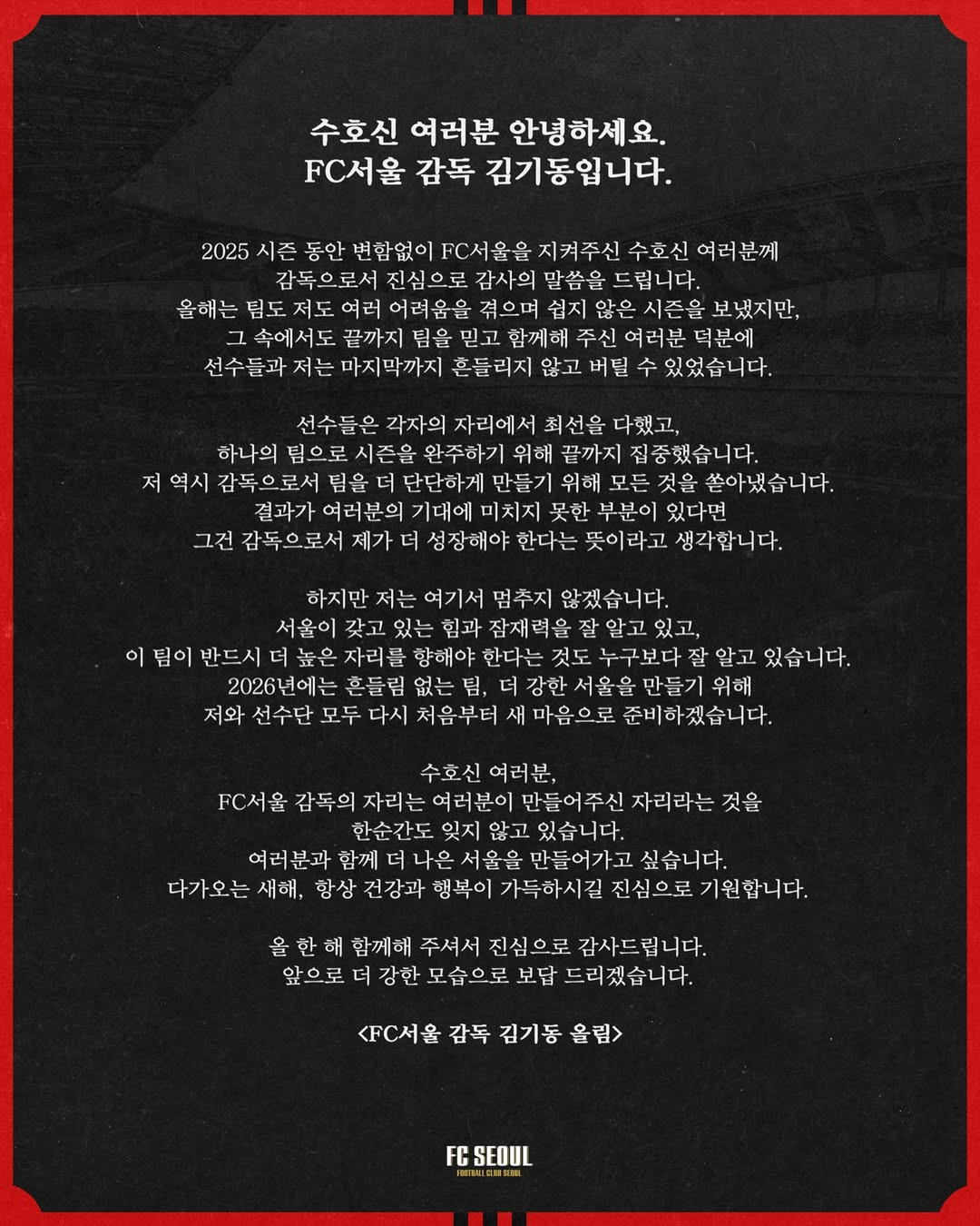 그러면서 "FC서울 감독의 자리는 여러분이 만들어주신 자리라는 것을 한순간도 잊지 않고 있다"며 "여러분과 함께 더 나은 서울을 만들어가고 싶다. 다가오는 새해, 항상 건강과 행복이 가득하시길 진심으로 기원한다. 앞으로 더 강한 모습으로 보답드리겠다"고 다짐했다.