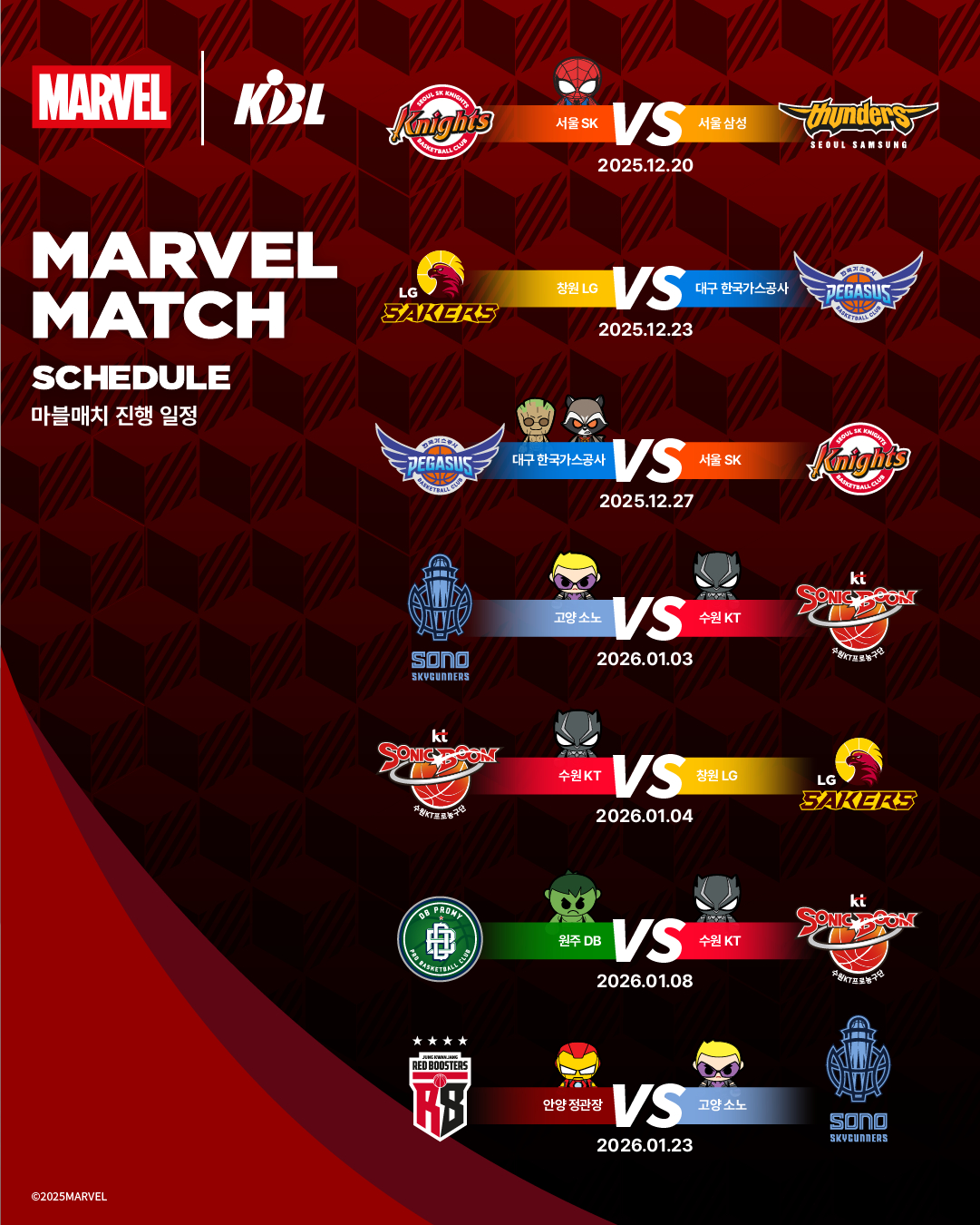 KBL은 15일 보도자료를 통해 디즈니코리아와 협업해 '마블 매치(MARVEL MATCH)'를 개최한다고 밝혔다. 연맹에 따르면 이번 프로젝트는 마블 히어로 테마를 적용한 한정판 굿즈와 다양한 현장 이벤트를 통해 팬들에게 색다른 경기 관람 경험을 제공하기 위해 기획됐다.