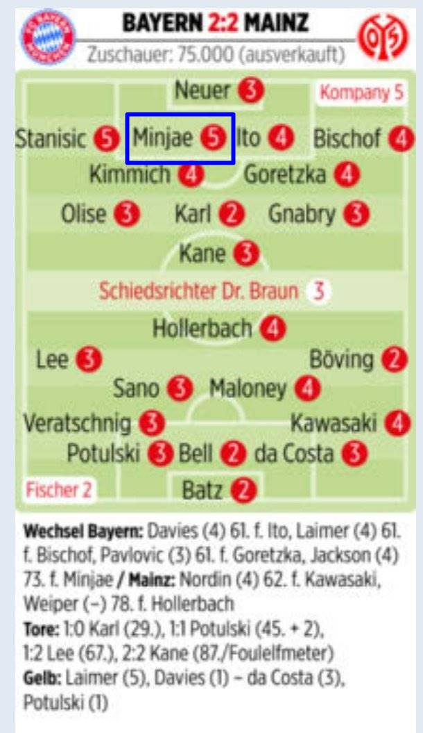 이 경기에서 뮌헨은 마인츠에 두 개의 실점을 내주며 패배 직전까지 내몰렸다. 후반 막바지 해리 케인(31)의 페널티킥 득점에 힘입어 승점 1을 간신히 따냈다.