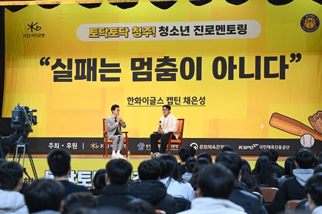 행사 첫 순서로 한화이글스 주장 채은성이 '실패는 멈춤이 아니다'를 주제로 강연에 나섰다. KB에 따르면 채은성은 신고 선수로 프로 무대에 입단한 이후 꾸준한 노력과 단계적인 목표 설정을 통해 KBO리그를 대표하는 선수로 성장하기까지의 과정을 직접 들려줬다.