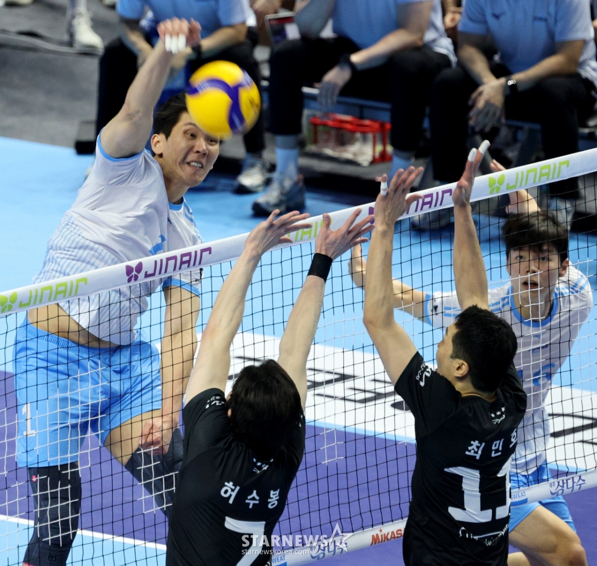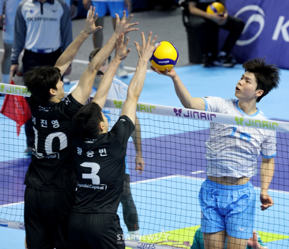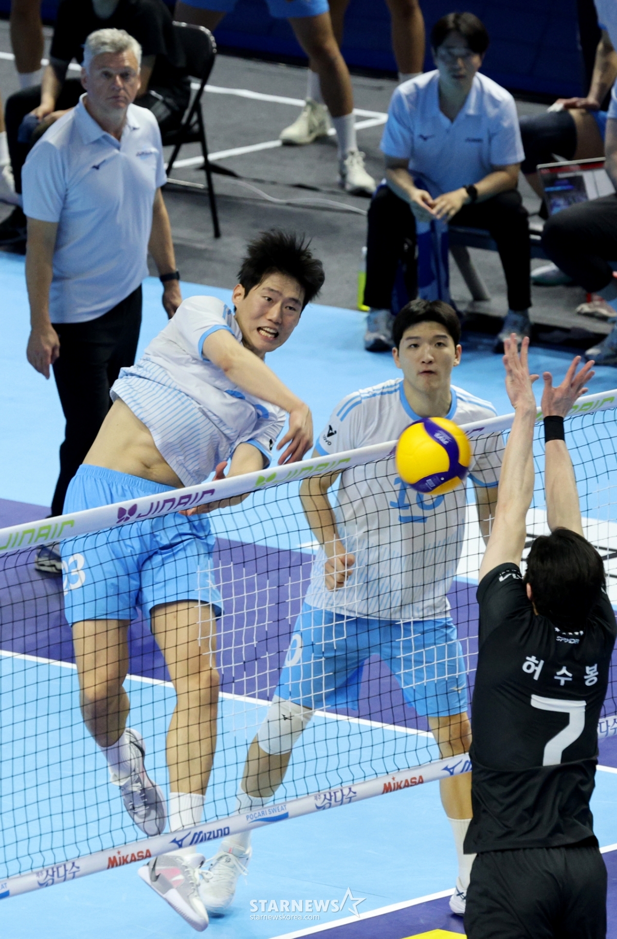 대한항공 김규민이 16일 계양체육관에서 열린 2025-2026 진에어 V리그 남자부 대한항공과 현대캐피탈의 경기에서 블로킹을 돌파하는 강타를 터트리고 있다. 2025.12.16.