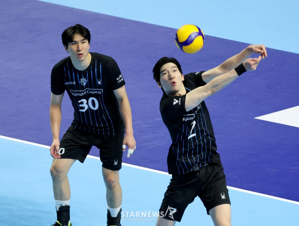 현대 허수봉과 신호진이 16일 계양체육관에서 열린 2025-2026 진에어 V리그 남자부 대한항공과 현대캐피탈의 경기에서 리시브를 하고 있다. 2025.12.16.