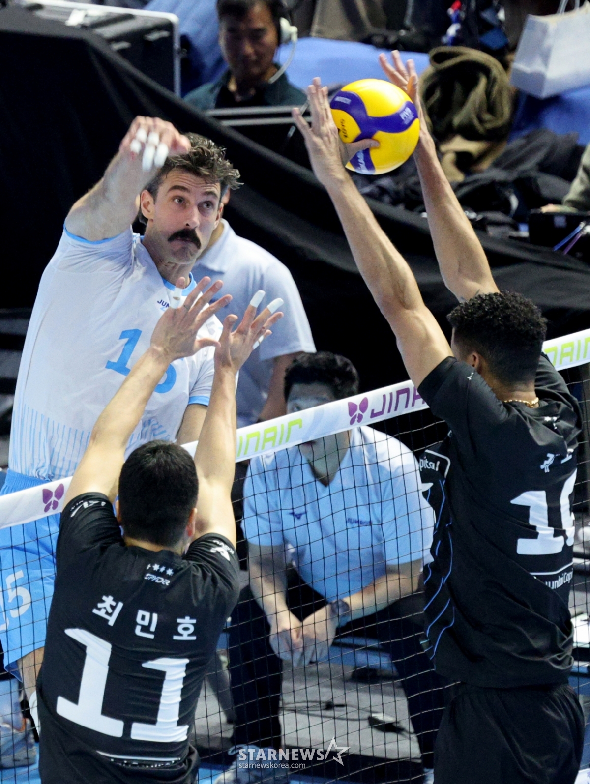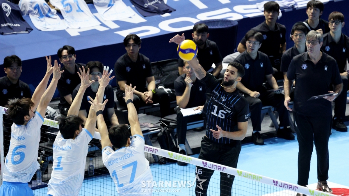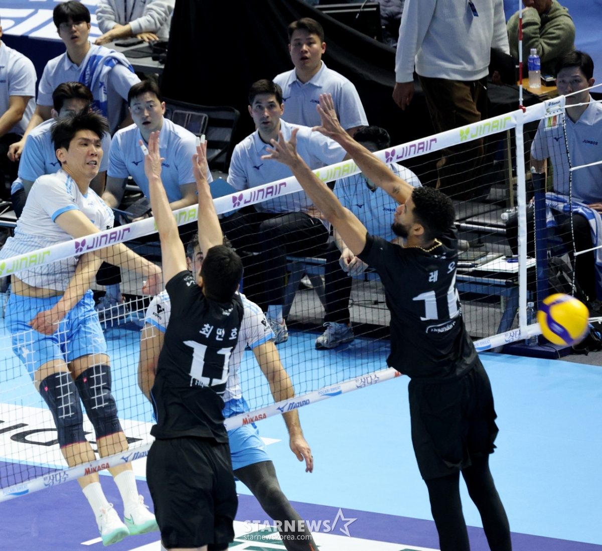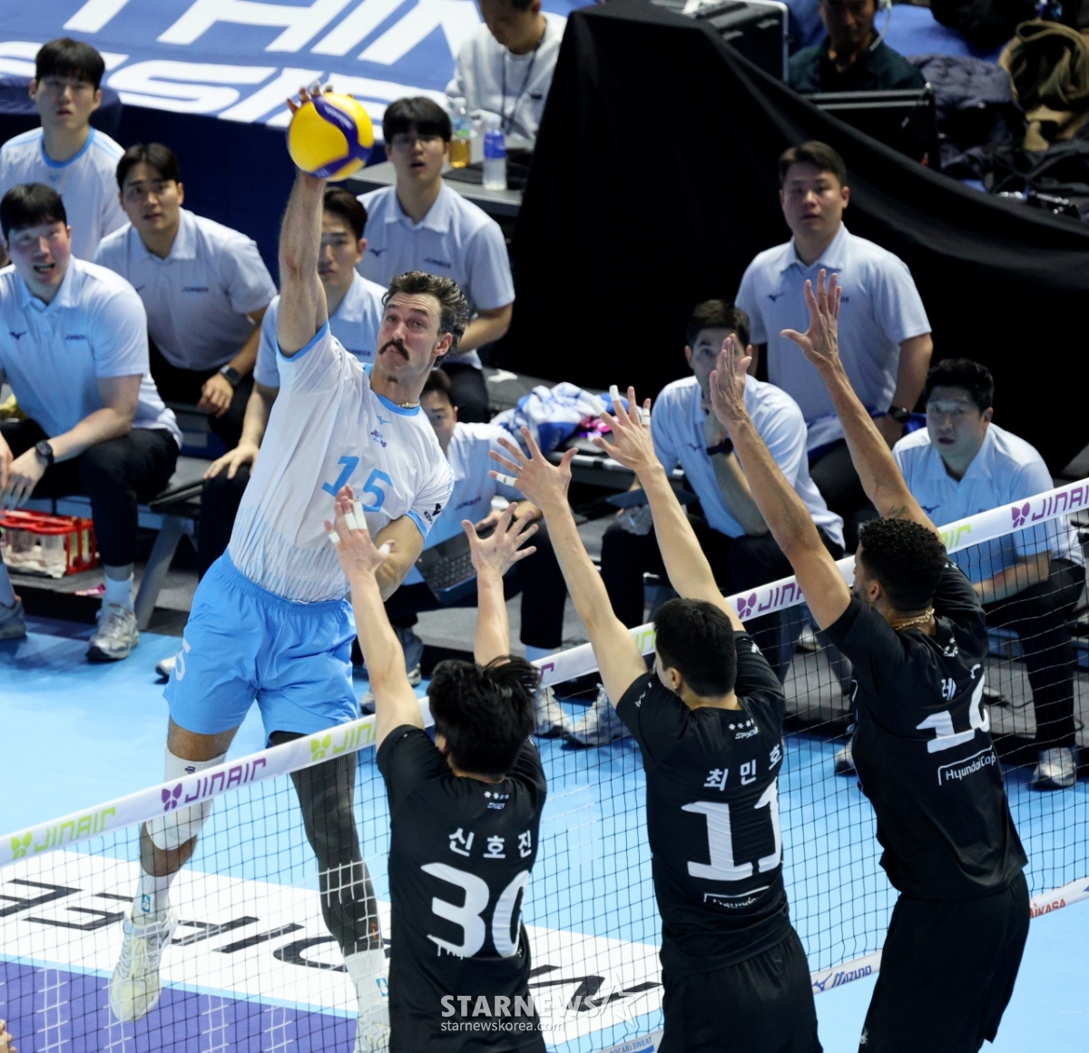 대한항공 러셀이 16일 계양체육관에서 열린 2025-2026 진에어 Vf리그 남자부 대한항공과 현대캐피탈의 경기에서 레오에 강타를 터트리고 있다. 2025.12.16.