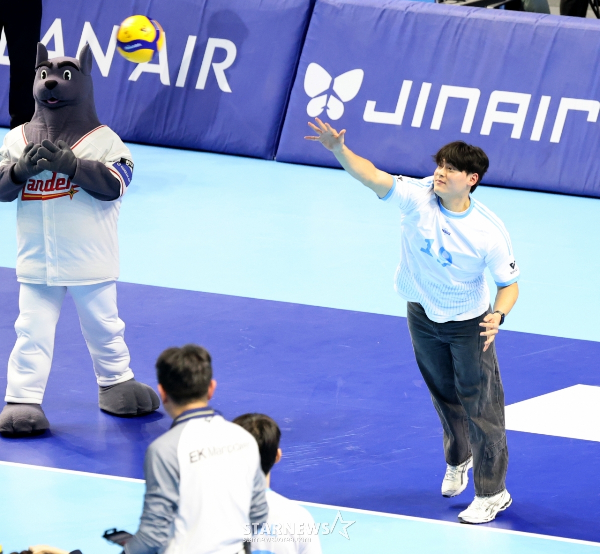 SSG 마무리투수 조병헌이 16일 계양체육관에서 열린 2025-2026 진에어 V리그 남자부 대한항공과 현대캐피탈의 경기에서 시구를 하고 있다. 2025.12.16.
