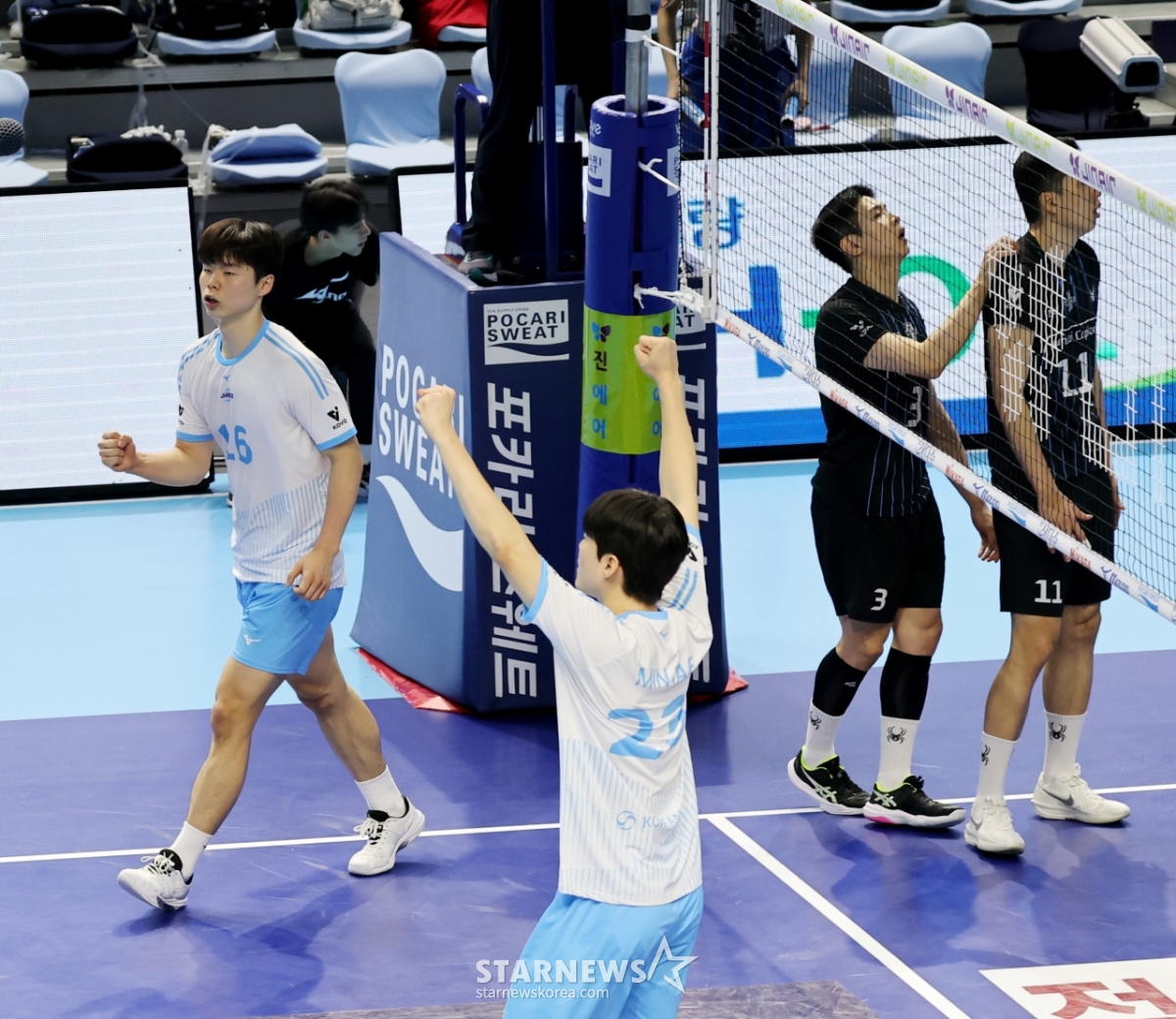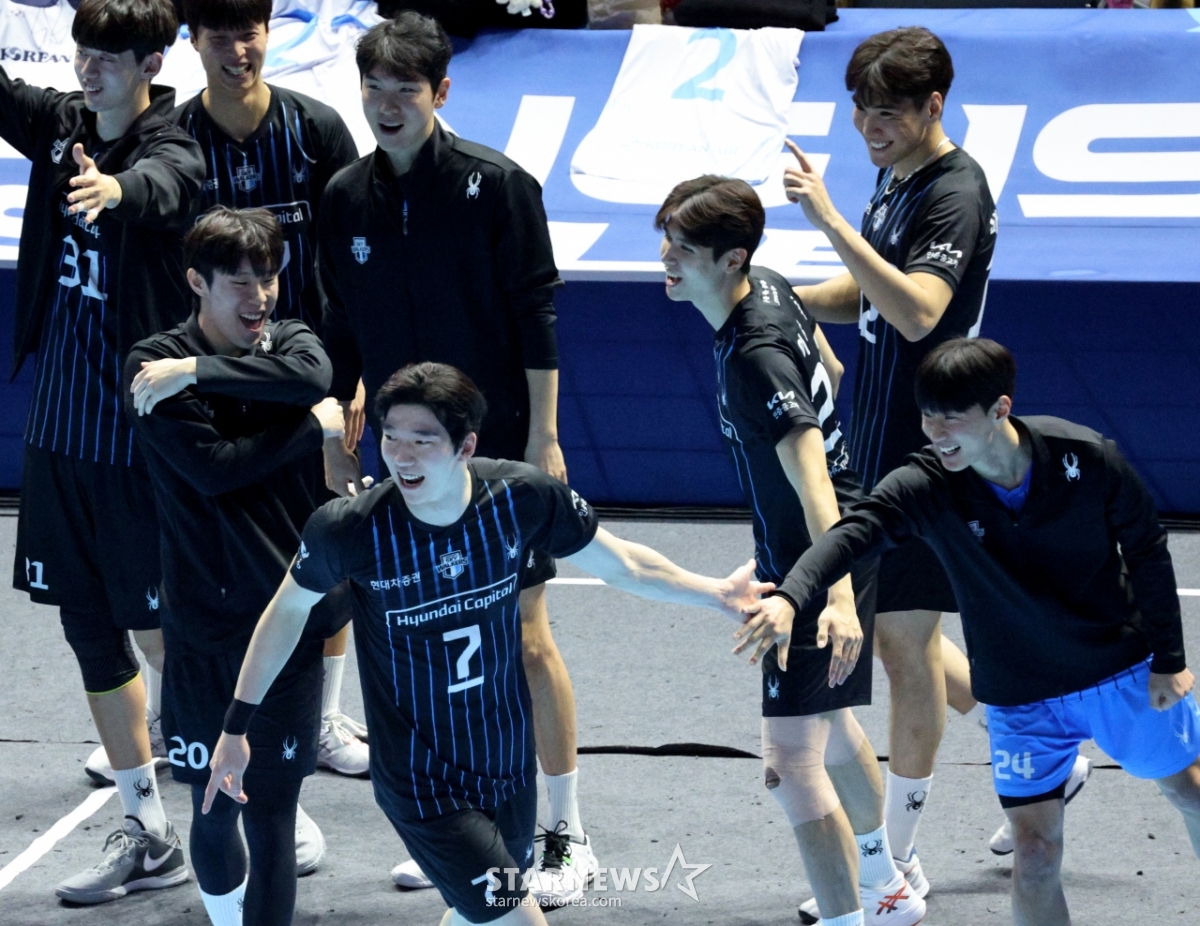 대한항공 정지석 등 선수들이 16일 계양체육관에서 열린 2025-2026 진에어 Vf리그 남자부 대한항공과 현대캐피탈의 경기에서 승리한 후 자축하고 있다. 2025.12.16.