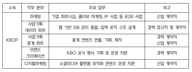 KBOP는 마케팅, 사업기획·데이터 파트, 사업기획 중계 파트, 브랜드 크리에이션, 디지털 마케팅 등 총 5개 직무 분야에서 채용이 열린다.