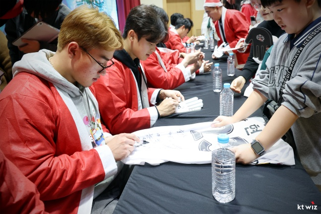 KT 선수들은 19일 경기도 수원 특례시 팔달구 인계동에 위치한 수원시청 대강당에서 제14회 수원 사랑의 산타 행사에 참여했다.