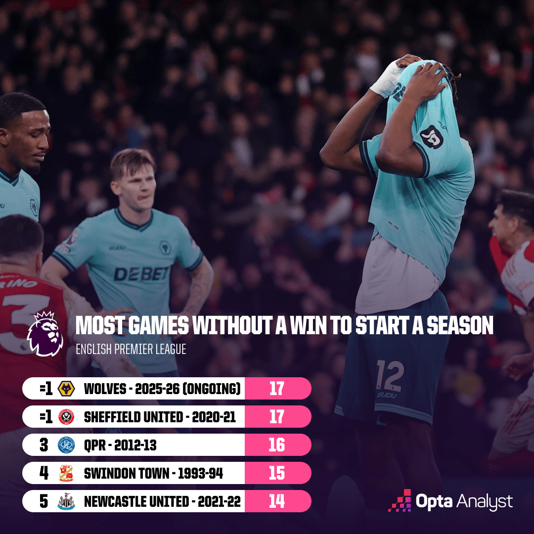 불명예 기록이다. 통계 전문 매체 '옵타'에 따르면 울버햄튼의 개막 17경기 무승은 EPL 시즌 초반 최다 무승 기록과 타이다. 앞서 2020~2021시즌 셰필드 유나이티드가 17경기에서 2무 15패 승점 2를 기록한 바 있다.
