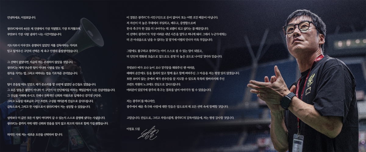 이정효 감독은 "광주FC에서 팀 구축과 전술적 목표를 이뤘다"며 "이번 결정은 금전이나 조건 때문이 아니라, 더 높은 무대에서 한국 축구가 한 걸음 더 나아가는데 보탬이 되고 싶다는 꿈 때문"이라며 강기정 구단주 등 관계자들에게도 감사 인사를 함께 전했다.