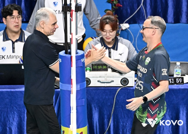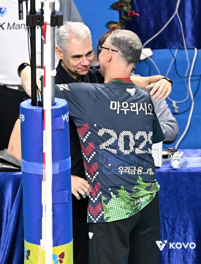 브라질 출신 사령탑 마우리시오 파에스(62·우리카드)와 레오나르도 카르발류(53·KB 손해보험) 감독이 이역만리 한국에서도 끈끈한 우정을 자랑했다.