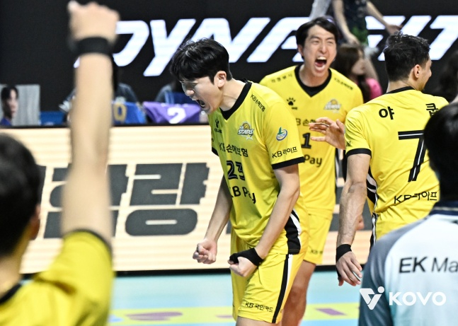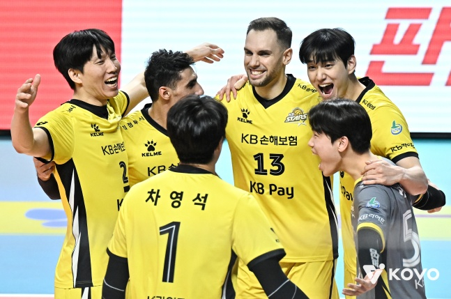 KB 손해보험이 공격과 수비 모두에서 완벽하게 밀린 2세트를 극복하고 풀세트 없이 승점 3점을 따냈다.