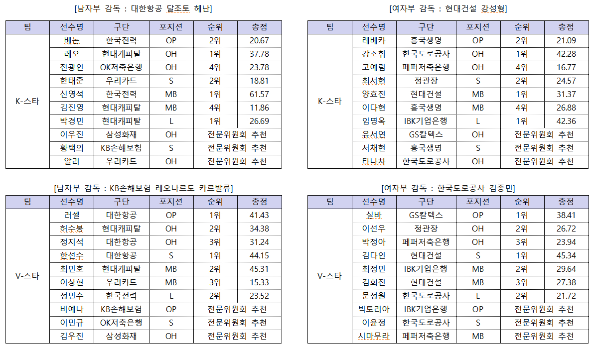 KOVO의 22일 발표에 따르면 이번 올스타전 선수는 팬 투표 70%, 선수단 투표(감독·수석코치·주장) 15%, 미디어 투표(기자·중계사) 15%를 합산해 28명이 선발됐고, 여기에 전문위원회 추천 선수 12명이 더해져 총 40명이 이름을 올렸다.